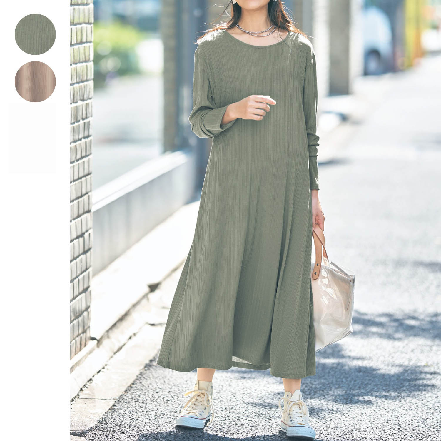 ワンピースのシルエット自体はシンプルでありながら、表情のあるおしゃれなランダムリブでおしゃれ見えを実現。裾に向かって広がるフレアシルエットがフェミニンさを際立たせてくれます。ロングシーズン着られる便利な1着。デコルテをきれいに見せてくれるネックライン。フレアシルエットなので脚さばきのよさもバッチリ。伸縮性のあるテレコ素材で着心地のよさもバッチリ。
