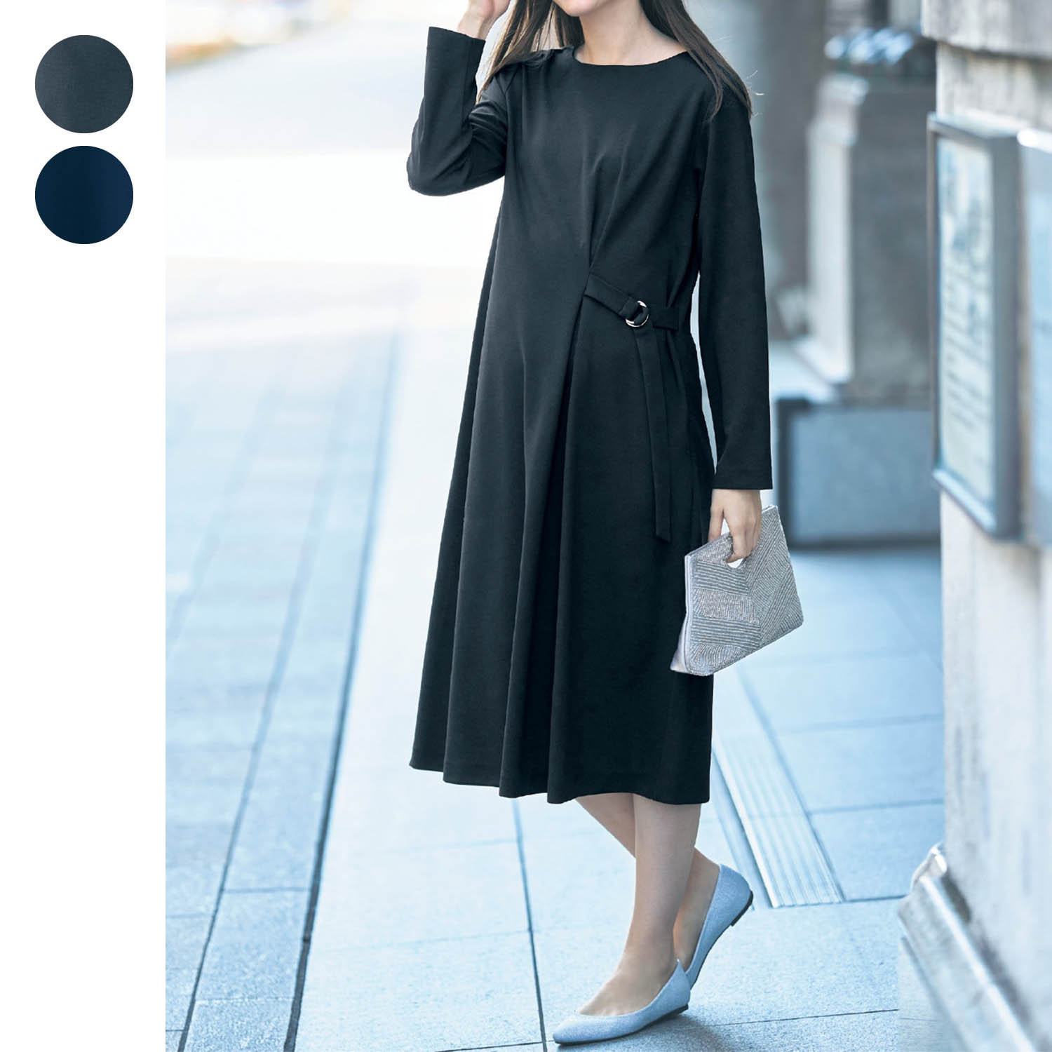 ―デザイン・スタイリング―・落ち感がきれいで上品さたっぷりに着こなせる1着・ストレートシルエットですっきり見え、落ち着いた印象・フォーマルシーンだけでなく、デイリーにも活躍・後ろ襟部分は涙開き―機能―・Dカンベルトでウエスト調整可能・左右脇ファスナーに授乳口
