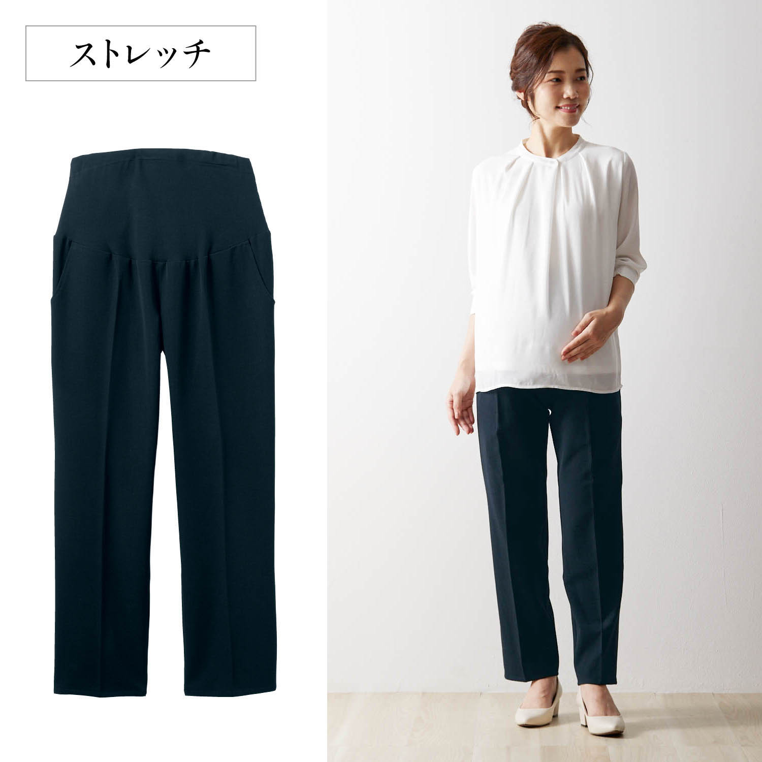 センタープレス入りのテーパードシルエットですっきりはける美脚パンツ。ストレッチが効いているので動きやすくストレスフリーではけるのもポイントです。腹部はカットソー切り替えで臨月まで対応可能。アジャスターでサイズ調整可能抜け感のある九分丈お尻部分はフェイクポケット