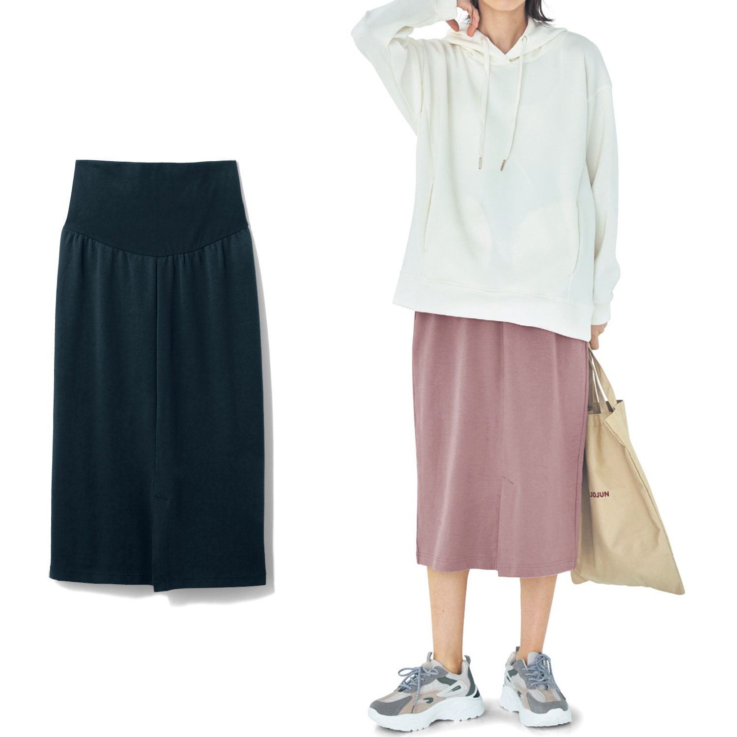 ―デザイン・スタイリング―・細目のシルエットながら、カットソー素材でラクなはき心地・スリット部分は肌が見えにくいベンツタイプなところも優秀―素材―・お腹部分はストレッチの効いたカットソーベア天竺素材・スカート部分は伸縮性のあるカットソーポンチ素材