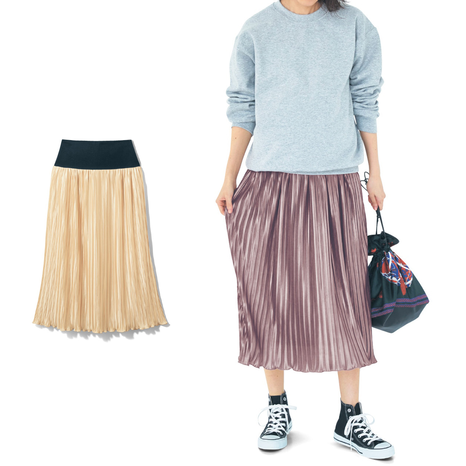―デザイン・スタイリング―・光沢感のある素材が華やぎを添えるプリーツスカート・動くたびに揺れるプリーツの表情が軽やかさを演出・プリーツが描くタテのラインで、スッキリとした脚長見せ効果も・トップスを選ばず合わせられるから、コーディネートの幅が広がる・同色の裏地付き―素材―・お腹部分はストレッチの効いたカットソーベア天竺素材・スカート部分は光沢感のあるスムース素材
