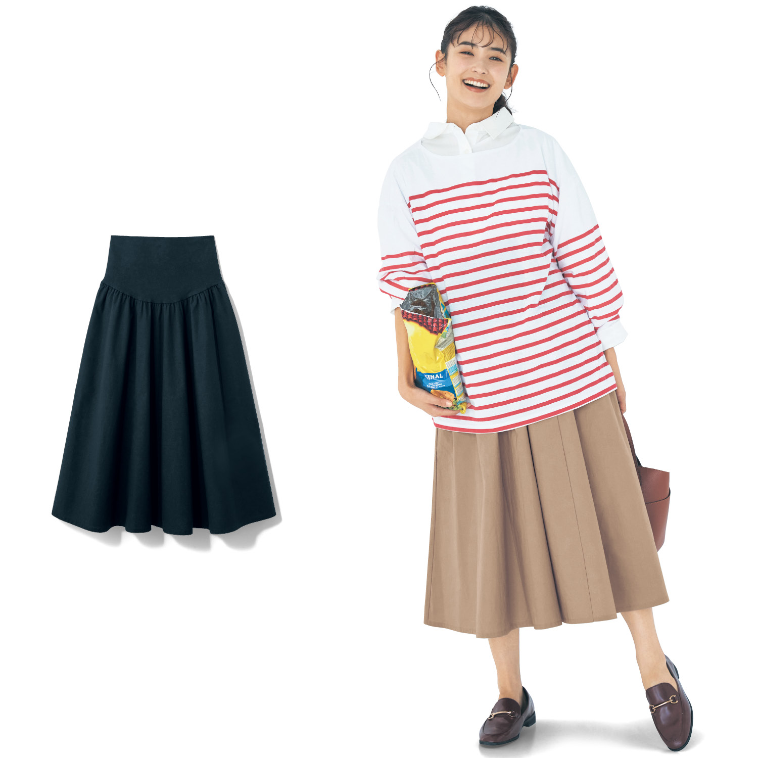 ―デザイン・スタイリング―・程よくハリのある素材でボリュームを持たせたロングスカート・ふんわりと広がるシルエットが着こなしに華やぎをプラス・両サイドにポケット付き―素材―・お腹部分はストレッチの効いたカットソーベア天竺素材・スカート部分の身生地は程よくハリのある綿100%のオックス素材