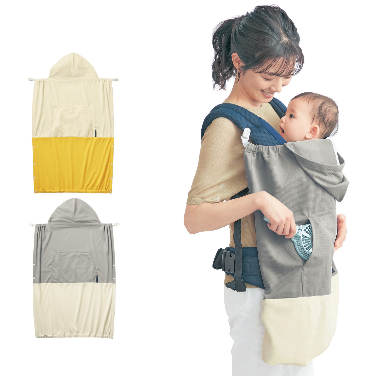 ー機能ー・抱っこひもを暑さや紫外線から守るケープ・お手持ちのハンディファンを入れられるポケット付き・ベビーに直接ファンが当たらない仕様・抱っこひもやベビーカーにクリップで簡単装着・裾のスナップボタンで3段階に長さ調節可能・ベビーの頭を日差しから守るフード付きー素材ー・遮熱とUVカットの機能素材SHADAN(R)を使用・ファンが入るポケット裏側はメッシュで通気性抜群ーデザイン・スタイリングー・ママとパパで共有しやすいカラーリング