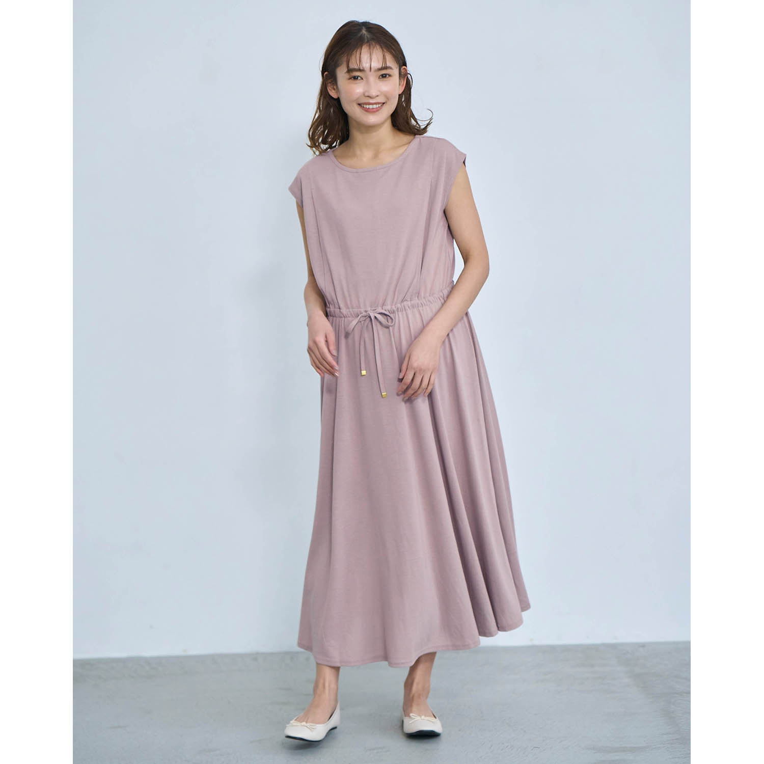 ―デザイン・スタイリング―・夏にも1枚でサラリと着られる、シンプルなワンピース・ウエストのドロストでサイズ調節が可能・産前から産後まで長く活躍―機能―・素早く汗を吸収し、汗ジミが出るのを防ぐ特殊加工・ワキの部分に消臭テープ付き・スリット仕様の授乳口付き―素材―・程よい伸縮性と落ち感のあるレーヨン混の天竺素材