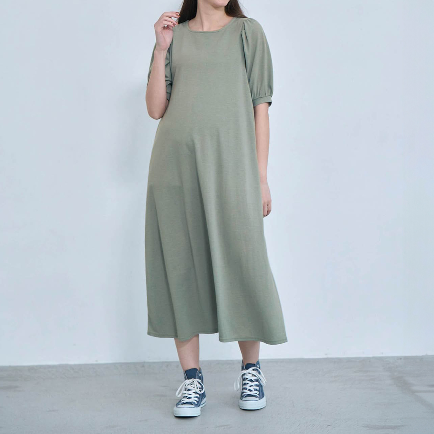 ―デザイン・スタイリング―・ふんわりとしたギャザースリーブが可愛いマタニティワンピース・腕のラインもさり気なくカバーできるのがうれしい・ラクに着られるAラインシルエット・産前から産後まで長く活躍―機能―・素早く汗を吸収し、汗ジミが出るのを防ぐ特殊加工・ワキの部分に消臭テープ付き・スリット仕様の授乳口付き―素材―・程よい伸縮性と落ち感のあるレーヨン混の天竺素材