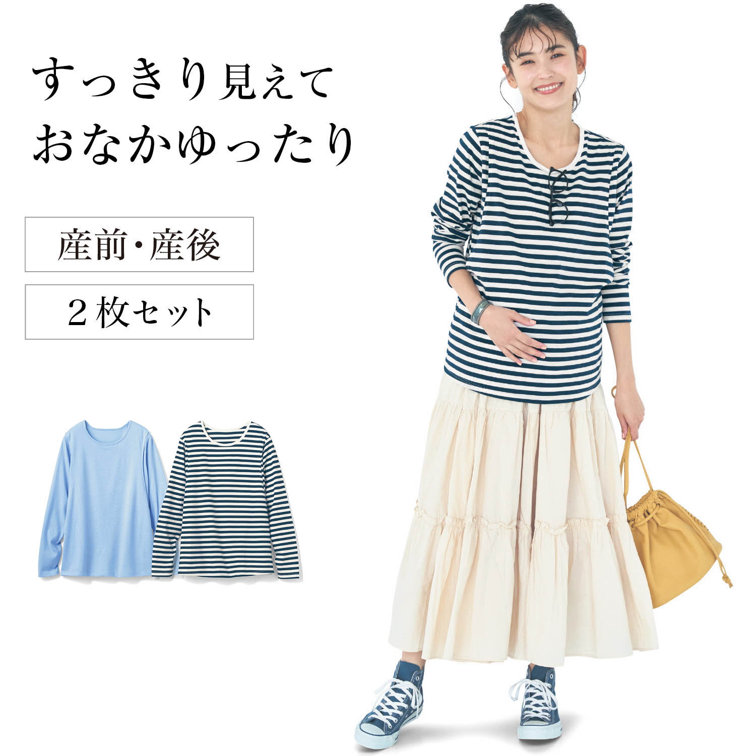 ―デザイン・スタイリング―・コーディネートを選ばず合わせやすいシンプルデザイン・色柄の異なる2枚セットで、洗い替えにも重宝・ネックラインは程よい開きで1枚でも重ね着でも着まわしやすい―素材―・1年中快適に着られる、肌ざわりの良い天竺素材―機能―・授乳口がついているので産後も大活躍