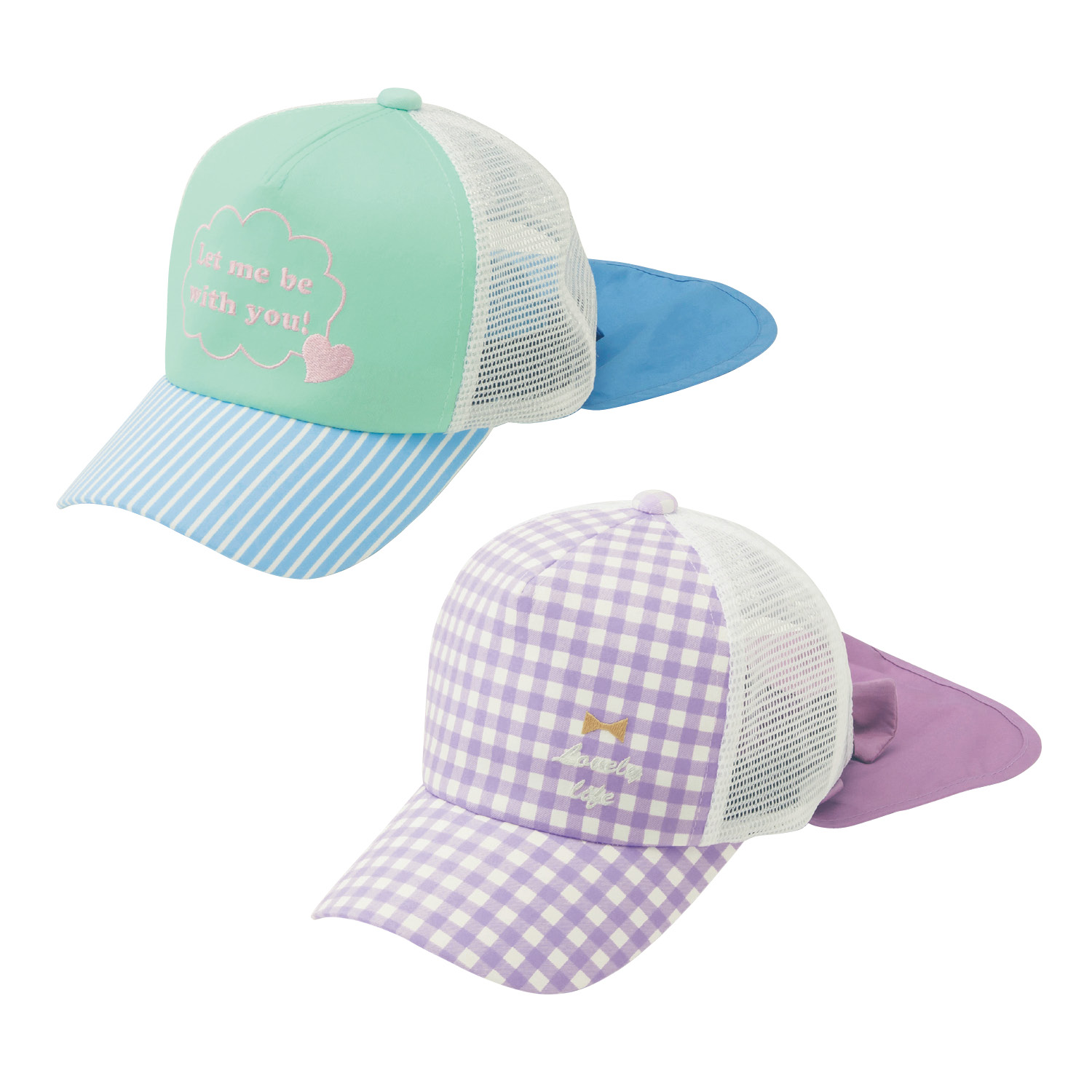 ーデザイン・スタイリングー・後ろの大きめリボンが女の子のハートをキャッチ・キュートな色柄にも心惹かれるキッズキャップ・暑い日のおしゃれにも役立つー機能ー・日よけクロス付きで昼間の外遊びも安心・日よけクロスは取り外せて便利・サイズ調節も簡単にできる