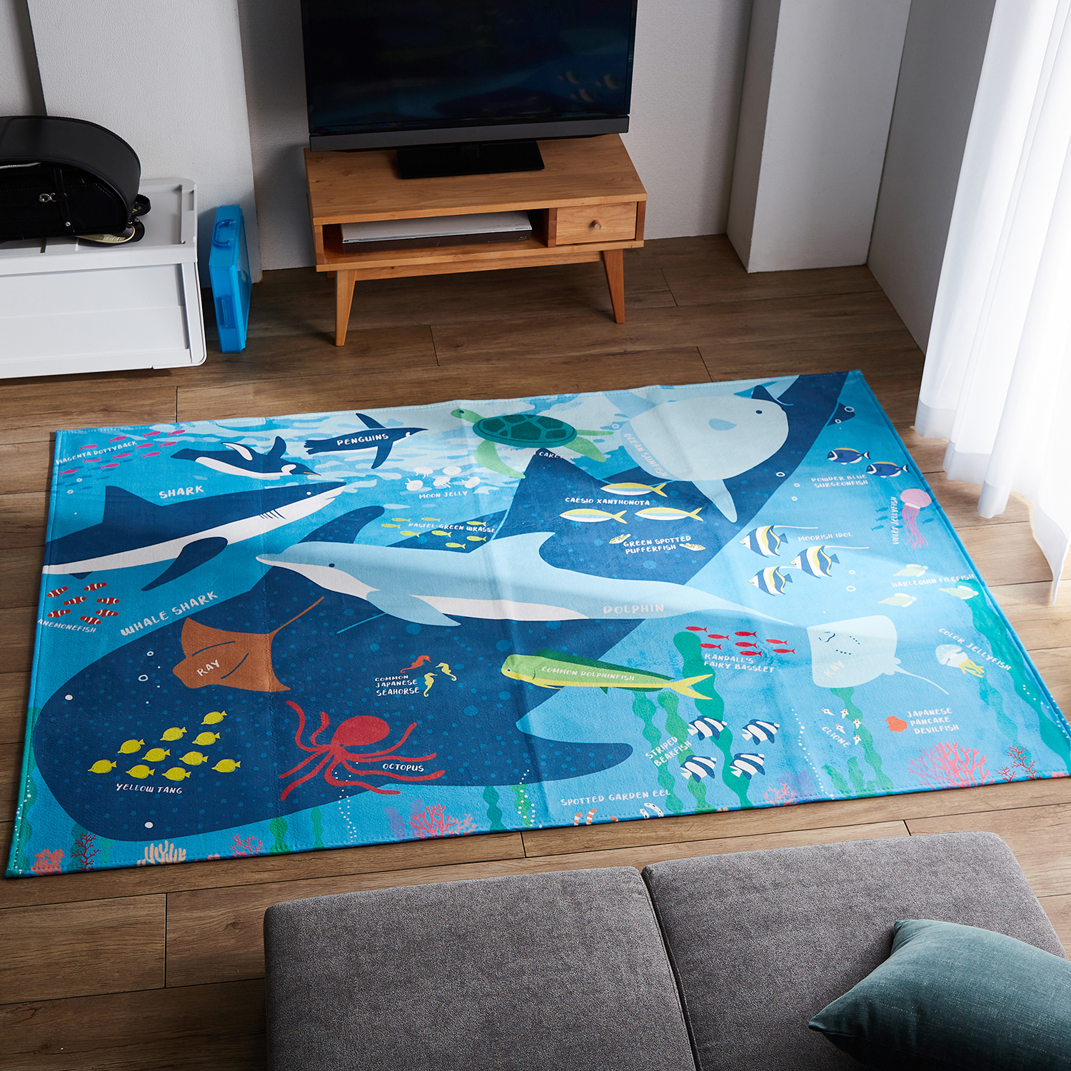 ―デザイン・スタイリング―・知りたがり屋な年頃のお子さまにぴったりのラグ・動物や地図を見て英単語を遊びながら学べます・リビングでも扱いやすいサイズ感・普段敷いているカーペットの上に敷いてもOK・プレイマットとしてお子様が遊ぶスペースに敷くのも◎・デスクマットとして机の下に敷くマットとしても◎・子供の成長と共に様々な用途でご使用いただけます・お子さまやお孫さんへの誕生日プレゼントにもおすすめ・入学、入園祝いなどの贈り物にも!―素材―・毛足は短めでゴミが入りにくいからお手入れも楽々・洗濯機で丸洗いできるのでいつでも清潔に―機能―・裏面はすべりにくい加工付き・床暖房、ホットカーペットでも使えるのも嬉しい現役パパが企画・デザインした子育ての思いがたくさん詰まったキッズラグ/・「動物園」柄は、道路が描かれているので乗り物を走らせて遊ぶのも楽しい・「水族館」柄は、様々な海の仲間たちが大迫力で描かれ見ごたえ抜群・「世界地図」柄は、各地に生息する動物たちの分布図も学べる・「世界地図(モノクロ)」柄は、大きくなっても使いやすい大人っぽいデザイン