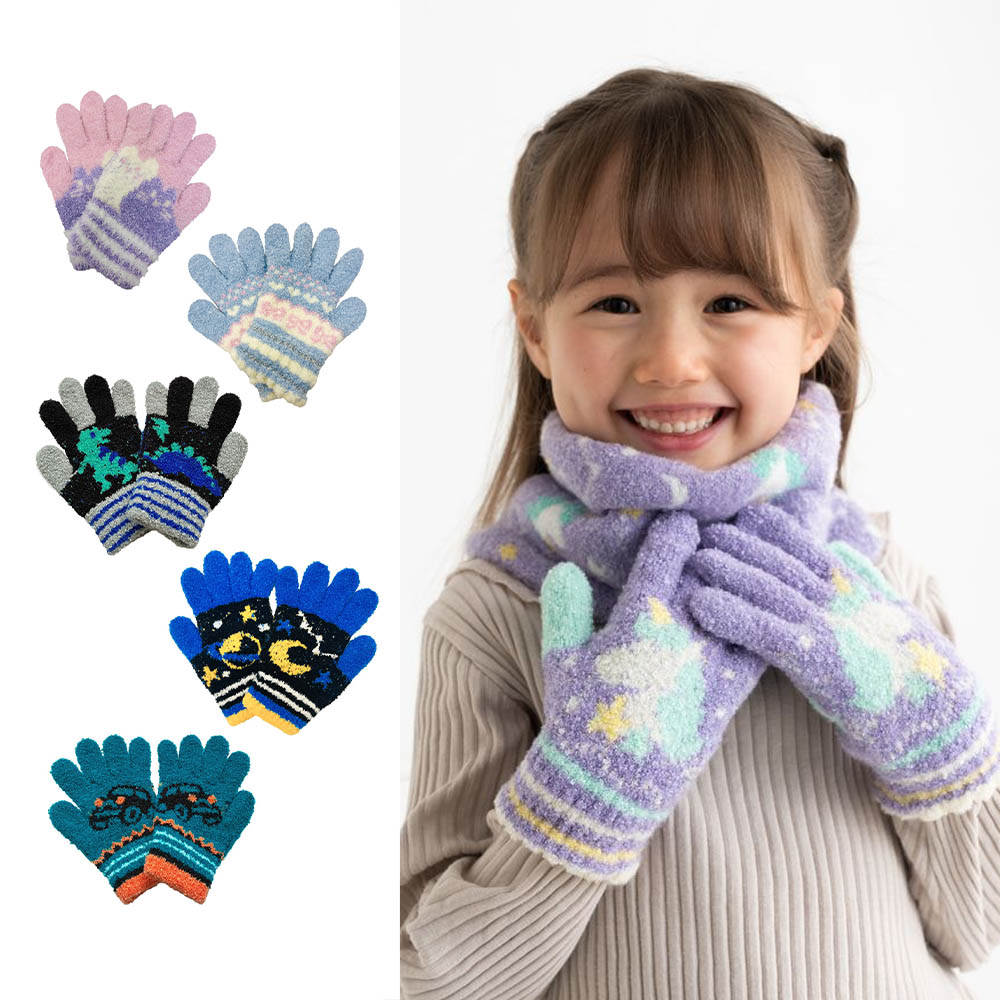 ―デザイン・スタイリング―・ユニコーンや恐竜などをデザインした手袋・印象的な配色やライン使いもおしゃれ・キャット、ドットはリボン装飾付き―素材―・発色がきれいでやわらかい糸を使用・ぐんと伸びるので子どもが自分で付けやすい