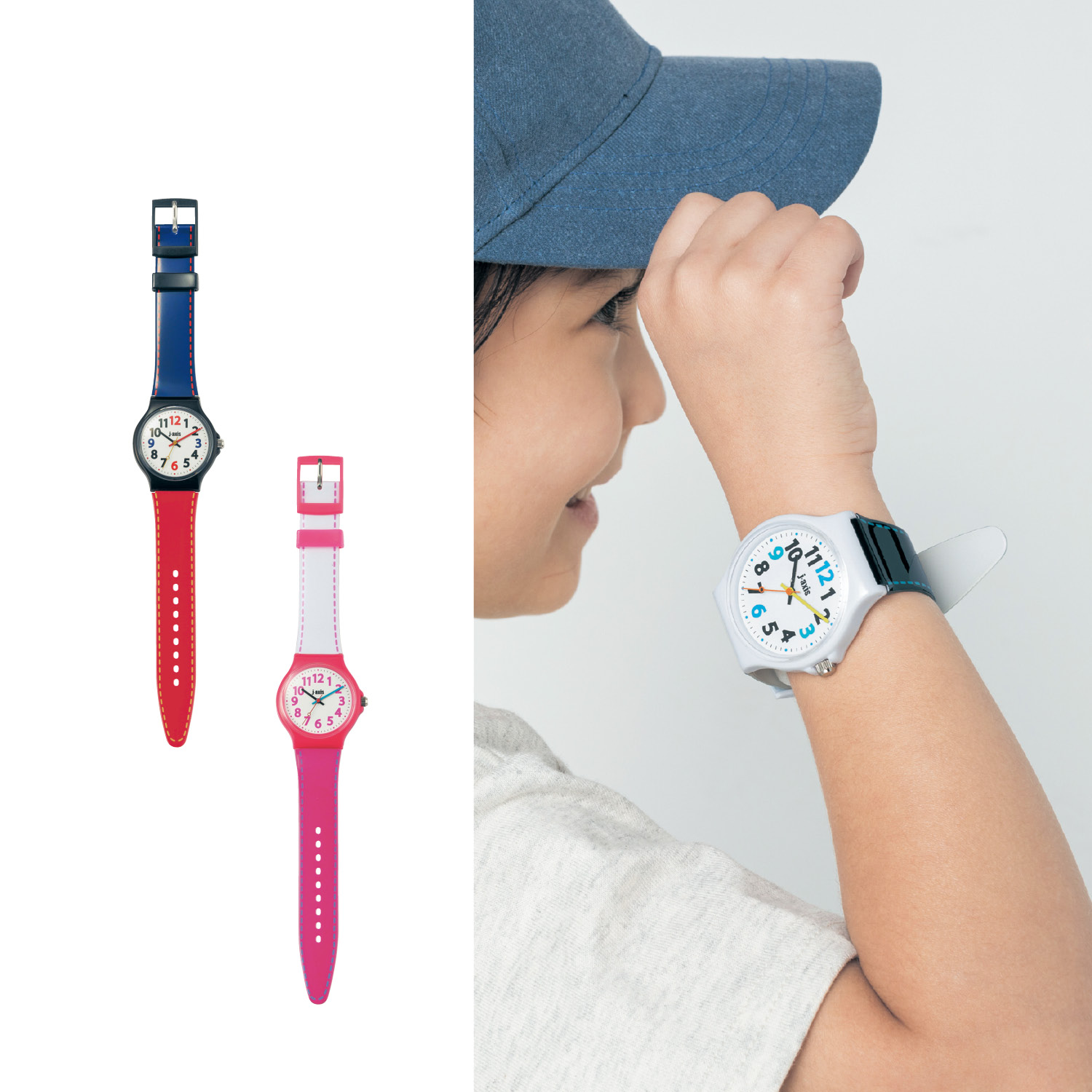 ―デザイン・スタイリング―・白い文字盤に数字や針が映えるアナログ文字盤の腕時計・ビビッドカラーの樹脂ベルトが、子どもの手首にやわらかくフィットします・一人で遊びに行くときや、習い事に出かけるときのお供に・時計の時間を読む練習に・時間を守る意識付けにも・自慢したくなるポップなカラーもおすすめ