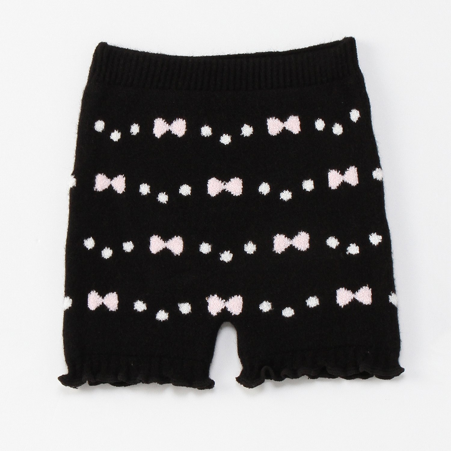 伸縮性の高いニット素材を使用した、フワフワのあったかボトム。足口にフリルをあしらって、愛らしいシルエットに仕上げています。ウエストはリブ編みの切替えで、すっきりとフィット。内側のタグには、お名前を書き込めるスペースがあります。