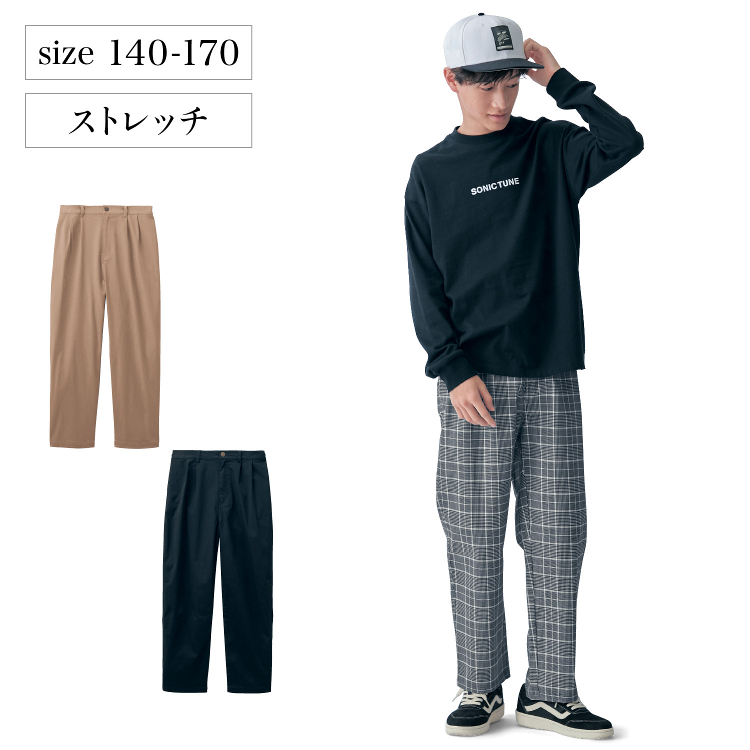 ―デザイン・スタイリング―・成長期の体形と動きを考えた、こだわりシルエットのテーパードパンツ・ゆったりとしたシルエットで、動きやすくラクなはき心地・カジュアルにもきれいめにも合わせやすく、スタイリングの幅が広がる・使いやすいベーシックカラーも◎・ウエストは後ろゴム仕様で程よくフィット―素材―・ストレッチの効いた薄手のツイル素材―機能―・アジャスターゴム付きでサイズを調節可能・便利な両脇ポケット付きSONIC TUNE(ソニックチューン)ソニックチューンは日常の着こなしにぴったりな「シンプルでカッコよく」を提案するオリジナルブランド。成長期の男の子に合わせたサイズや機能にこだわったアイテムを175サイズまで展開しています。