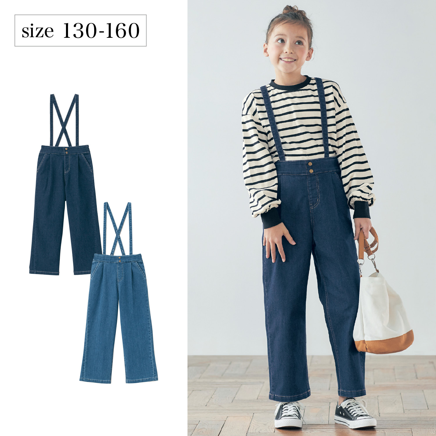 ―デザイン・スタイリング―・ゆとりのあるワイドシルエットに、ウエストの飾りボタンがちょっぴりお姉さん見え・サスペンダーの付け外しでコーデの幅が広がります―素材―・程よくストレッチが効いたデニム素材ー機能ー・ウエストはアジャスターゴムでサイズ調節可・サスペンダーの長さは3段階で調節可能・内側に油性ペンで直接書けてにじみにくいお名前スペース付き