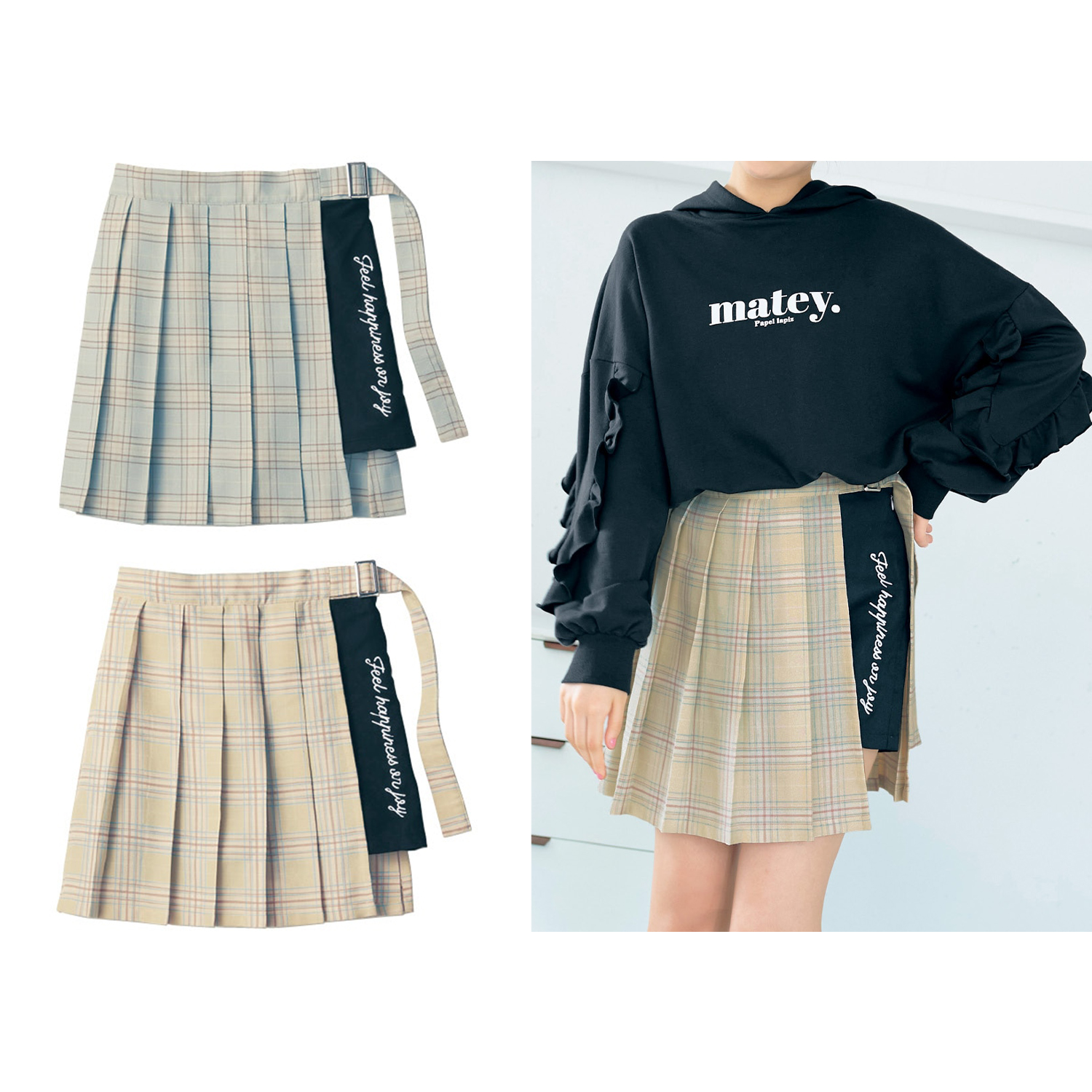 ロゴ入りの黒ショーパンにチェックプリーツを巻いたようなデザインが可愛いスカパン。ふわっとなびくプリーツのフレアシルエットが女子度を上げてくれます。ウエストの飾りベルトは垂らしてアクセントにするのが◎。【おすすめポイント】Dカン付きの飾りベルトがアクセントに効果的春らしい爽やかカラーを採用アジャスター付きの後ろゴムでサイズ調整可能便利なサイドポケット付きPapel lapiz(パペルラピス)ワタシの「好き」にフィットする、トレンドをおさえた好感度の高いおしゃれを提案するブランド。今のリアルなジュニア & ティーンの体形に合わせた独自のサイズを設定し、細部の着心地にもこだわりました。