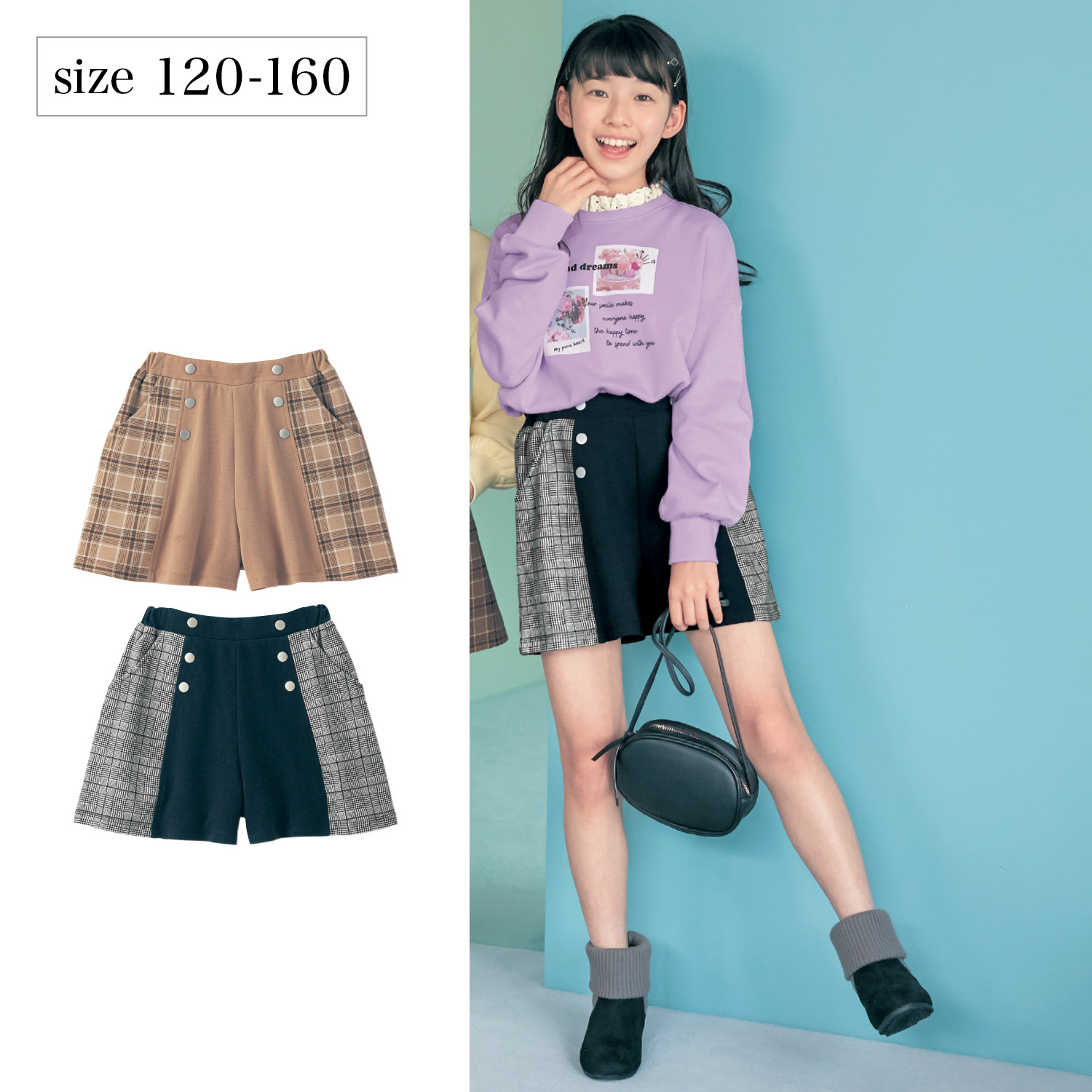 ―デザイン・スタイリング―・艶消しシルバーボタン & サイドのチェック柄切替えが大人っぽい・ゆったりシルエットのキュロットで可愛さと動きやすさを両立・フロントはゴム無しでトップスをインしてもすっきり・デイリーはもちろん、お出かけコーデにもぴったりの上品なデザイン―素材―・ラクにはけて動きやすいカットソー素材ー機能ー・ウエストは脇から後ろがゴム仕様で脱ぎはきもスムーズ