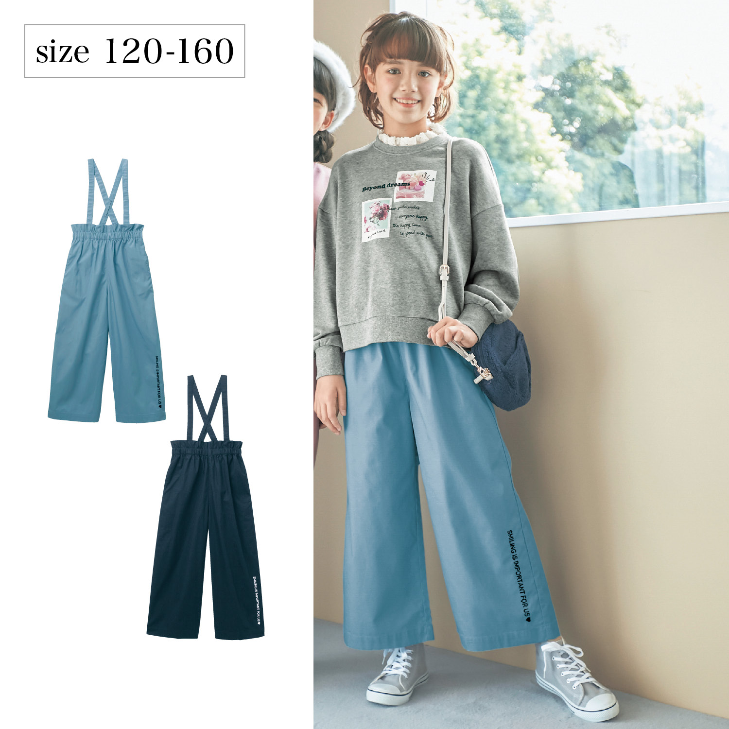 ―デザイン・スタイリング―・ウエストのフリルが甘い表情のワイドシルエットパンツ・サスペンダーが取り外せる2WAY仕様・左裾のロゴ刺繍がさり気ないアクセント・トップス次第でいろんなコーデが楽しめるー機能ー・サスペンダーの長さは3段階で調節可能・ウエストは総ゴム仕様でラクなはき心地・便利な右脇ポケット付き―素材―・おでかけもOKなきれい見えする布帛素材