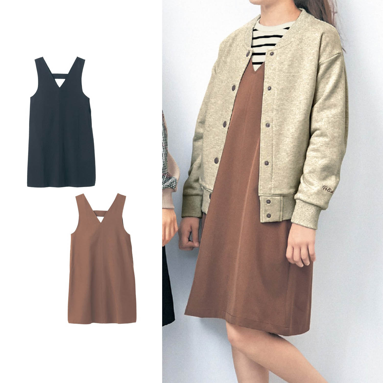 ―デザイン・スタイリング―・シンプルなラインと色で着回し力抜群・肩ひもの後ろタブやスカートのスリットなど、おしゃれなディテールがこだわり・厚めのトップスもインできるゆったりめの着用感・深めのVネックが上品な雰囲気ー機能ー・便利な右脇ポケット付き