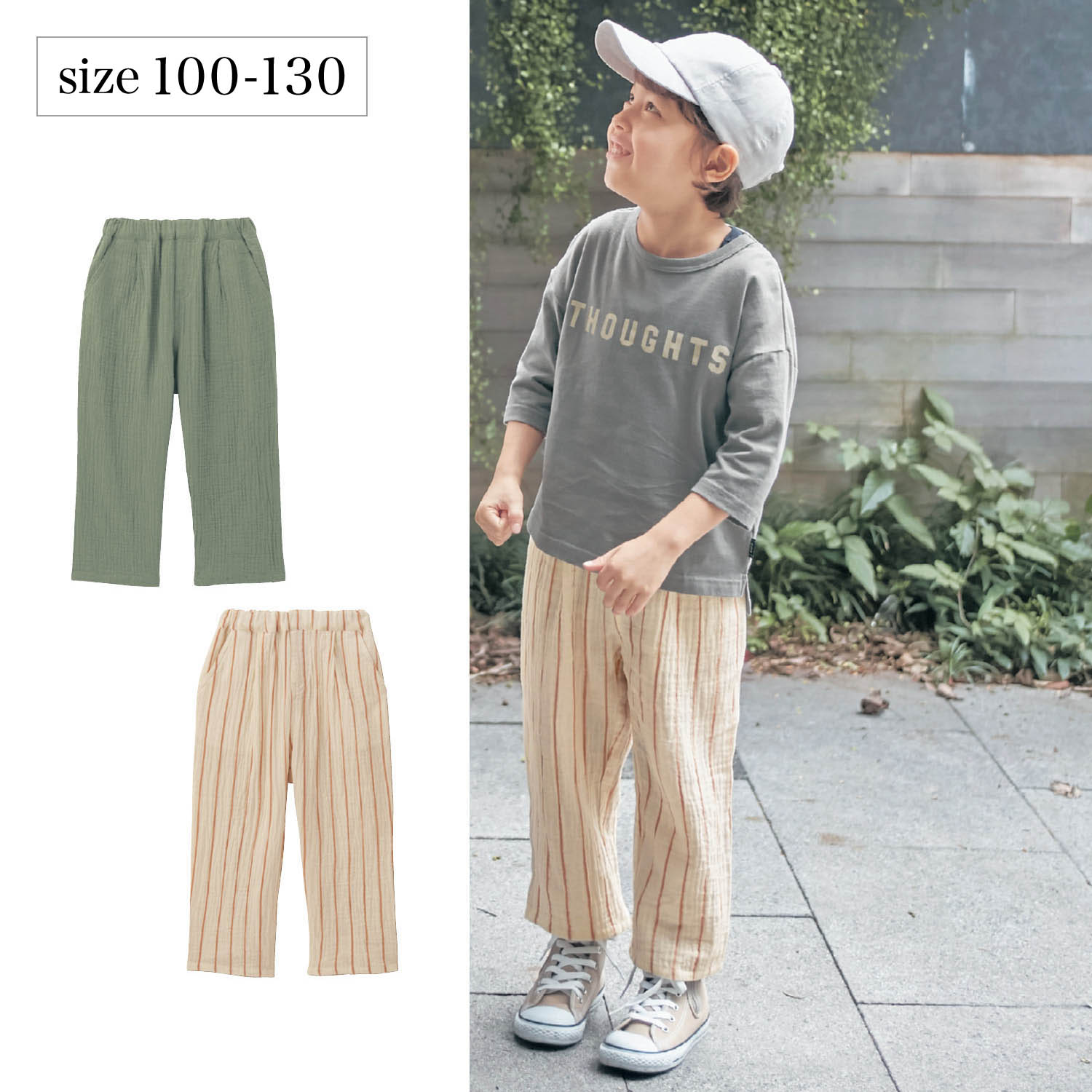 ―デザイン・スタイリング―・ワイドめのシルエットがおしゃれなロングパンツ・同素材のワンピースと親子リンクも楽しめる・ウエストは総ゴム仕様でらくちん・サイドとおしりにポケット付きで便利―素材―・シワが気になりにくいダブルガーゼ素材・綿100%のやさしい着心地も魅力