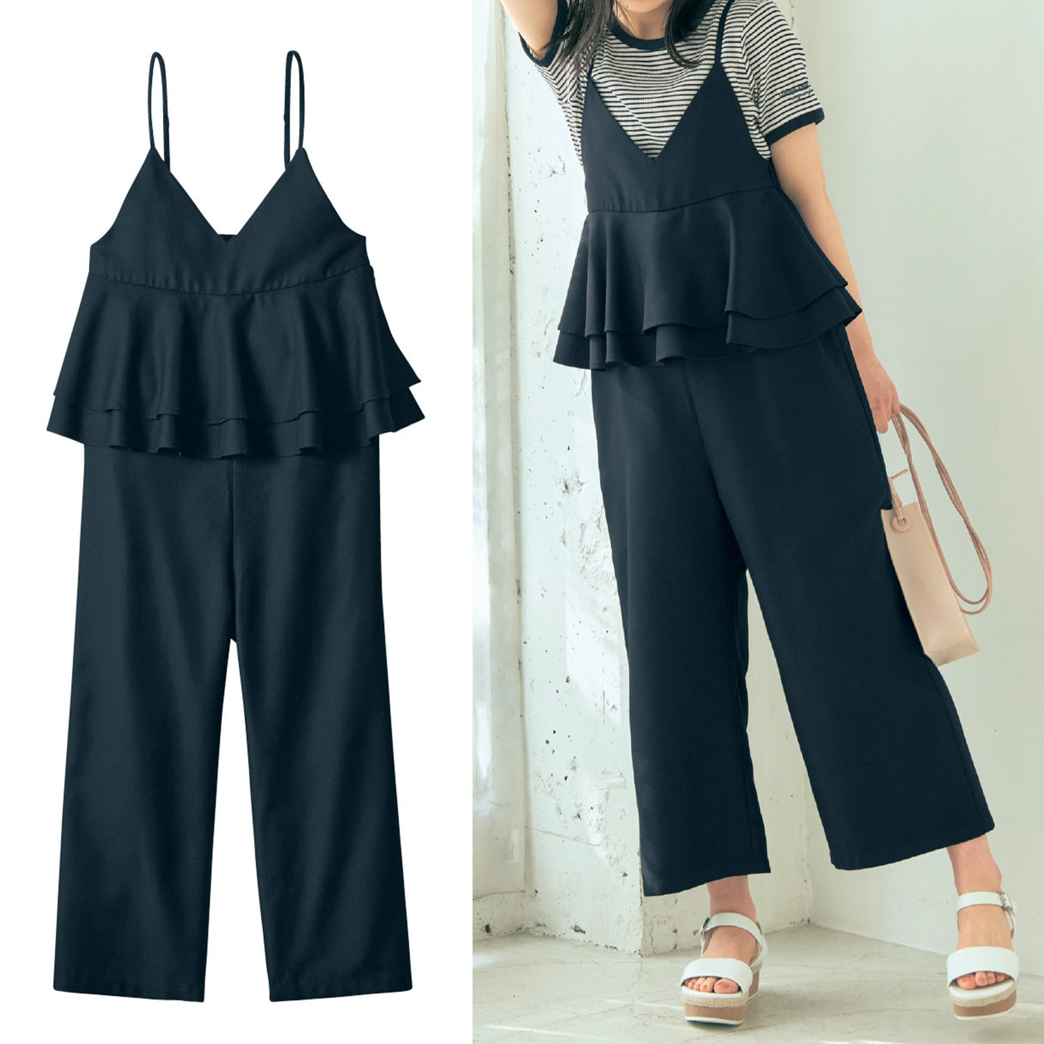 ―デザイン・スタイリング―・ペプラム風の2段フリルがガーリー・子どもっぽく見えない深めのVライン・華奢な肩ひもが女の子らしい・ワイドストレートで大人っぽいシルエット―素材―・着心地のよい柔らかなツイル素材―機能―・左脇ファスナー付き・右脇ポケット付き・アジャスター付きで肩ひも調節可能Papel lapiz(パペルラピス)ワタシの「好き」にフィットする、トレンドをおさえた好感度の高いおしゃれを提案するブランド。今のリアルなジュニア & ティーンの体形に合わせた独自のサイズを設定し、細部の着心地にもこだわりました。