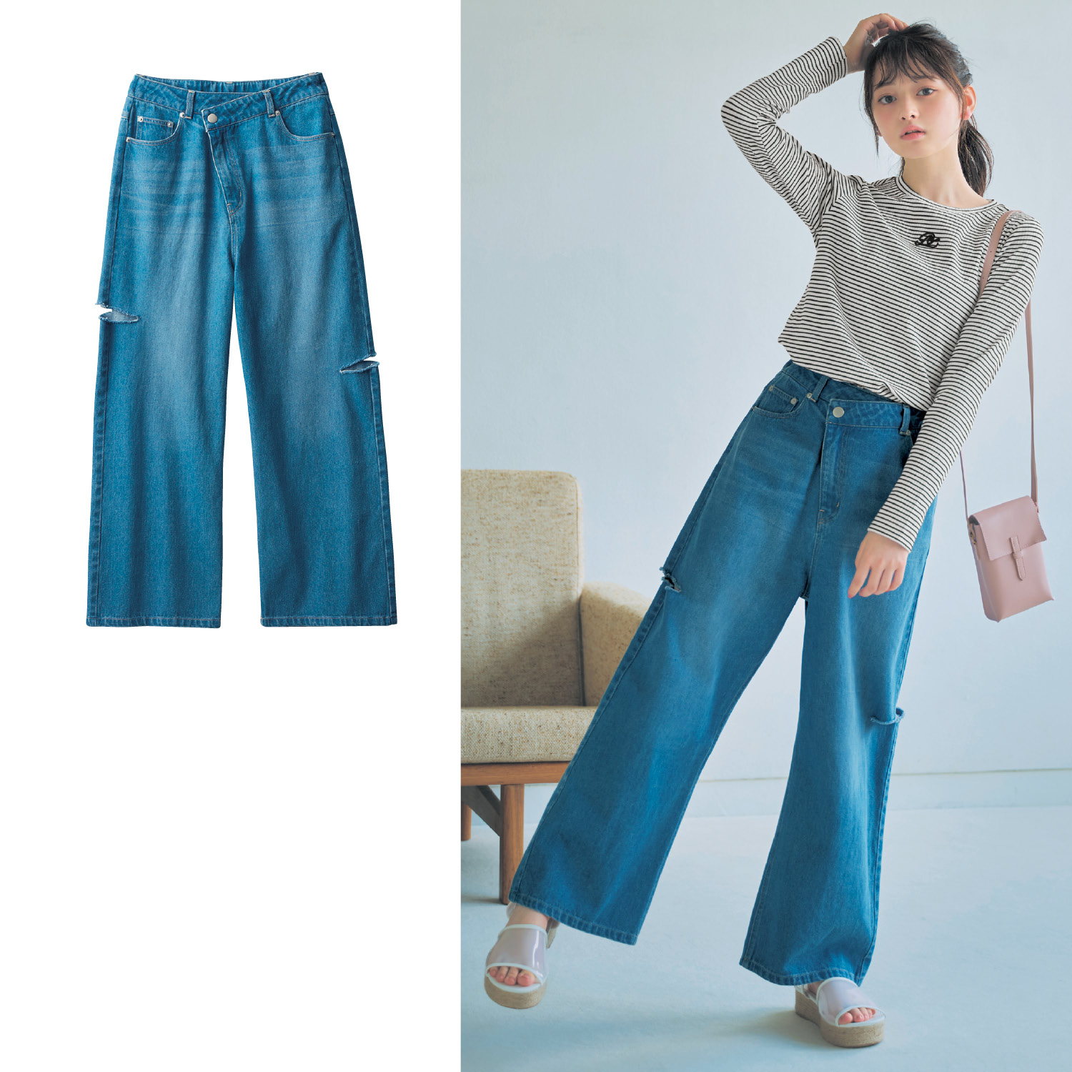 ―デザイン・スタイリング―・斜めファスナーのアシメデザインがおしゃれ・左右のカットオフディテールでこなれ見え・ゆったりバギーシルエットで体型カバーも・加工感のあるブルーの色味で着こなしやすい・カジュアルはもちろん甘めのトップスも好相性―素材―・身生地は綿100%のデニム素材―機能―・左右ポケット付き・着脱しやすいホックボタン・ウエストはアジャスターゴム付きで調節可能Papel lapiz(パペルラピス)ワタシの「好き」にフィットする、トレンドをおさえた好感度の高いおしゃれを提案するブランド。今のリアルなジュニア & ティーンの体形に合わせた独自のサイズを設定し、細部の着心地にもこだわりました。