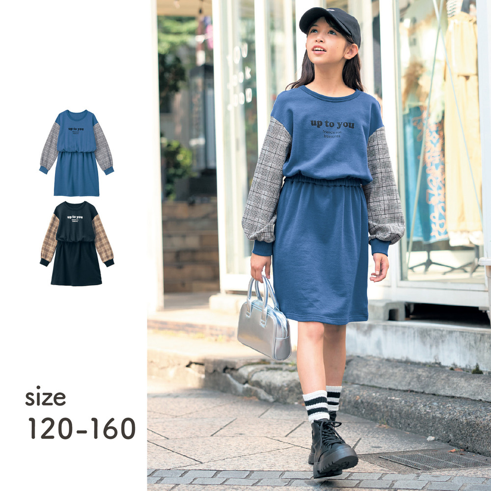 ―デザイン・スタイリング―・大人っぽガーリーなチェック柄の切替えワンピース・一枚で着映えて、デイリーおしゃれに重宝・ボリューミーな袖が女の子らしい・ウエストはゴム入りで、キュッと絞ったメリハリシルエット・フロントのロゴがクールなアクセントに―素材―・本体生地は肌にやさしい綿100%裏毛素材―機能―・便利な右脇ポケット付き・油性ペンで直接書けてにじみにくいお名前スペース付き