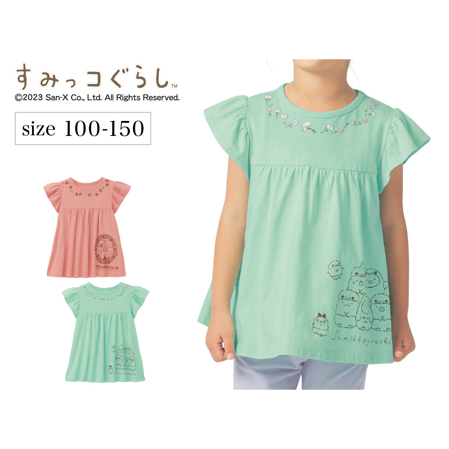 ―デザイン・スタイリング―・Aラインシルエットが女の子らしいチュニック・左裾にはすみっコたちをプリント・ピンクはイチゴ、ミントはお花の模様が首まわりに・大きなフリルスリーブは脇が見えにくい工夫もばっちり―素材―・身生地は薄手の綿100%天竺素材・汗をかいてもすっと乾くから、暑い時期も快適