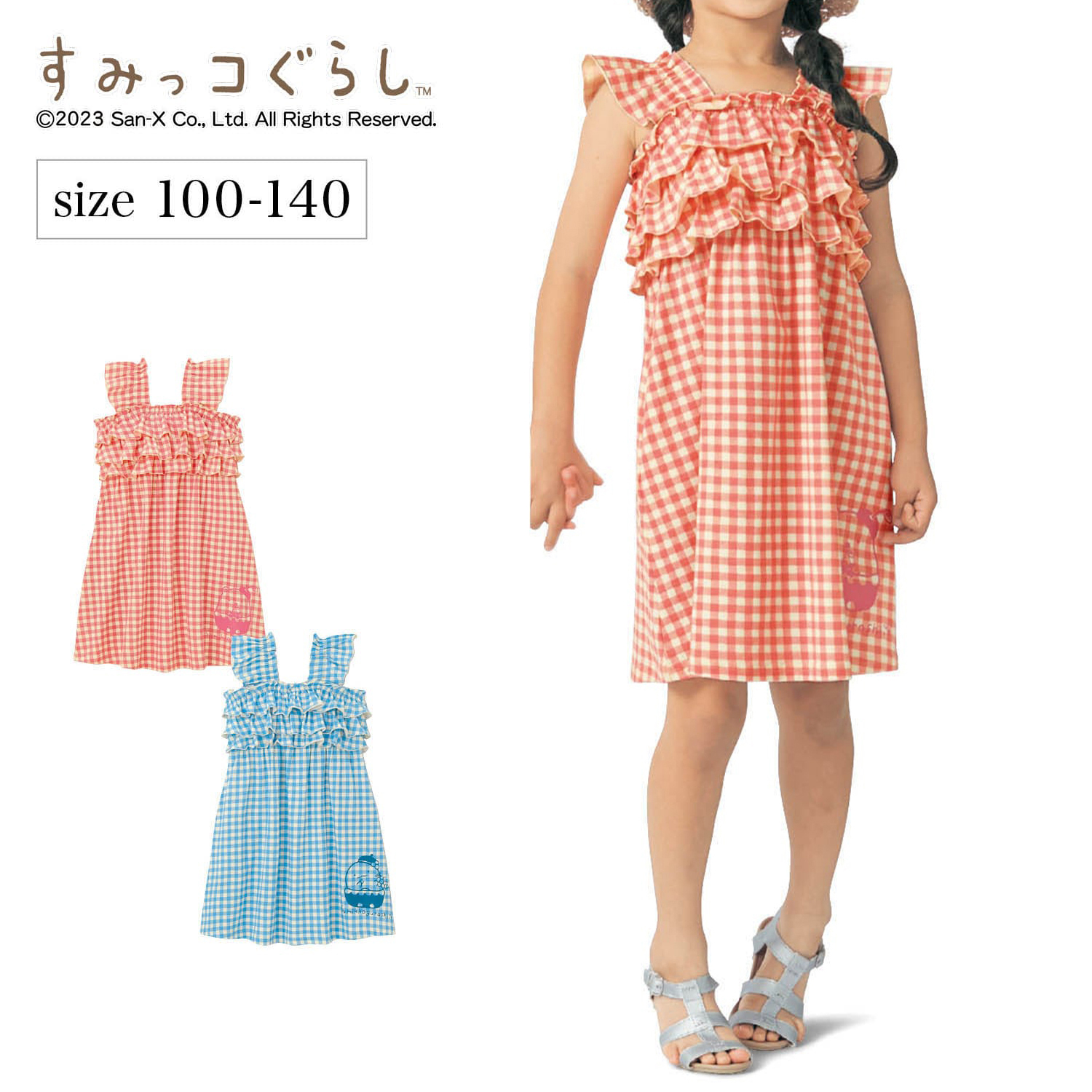 ―デザイン・スタイリング―・1枚で着映えるキュートなサマードレス・ギンガムチェックのスカートの裾に、すみっコを同色でプリント・肩ひもと身頃のたっぷりフリルが愛らしさ満点・便利な右脇ポケット付き―素材―・ソフトな肌ざわりの綿100%カットソー素材―機能―・肩ひもと胸元はゴム仕様で程よくフィット
