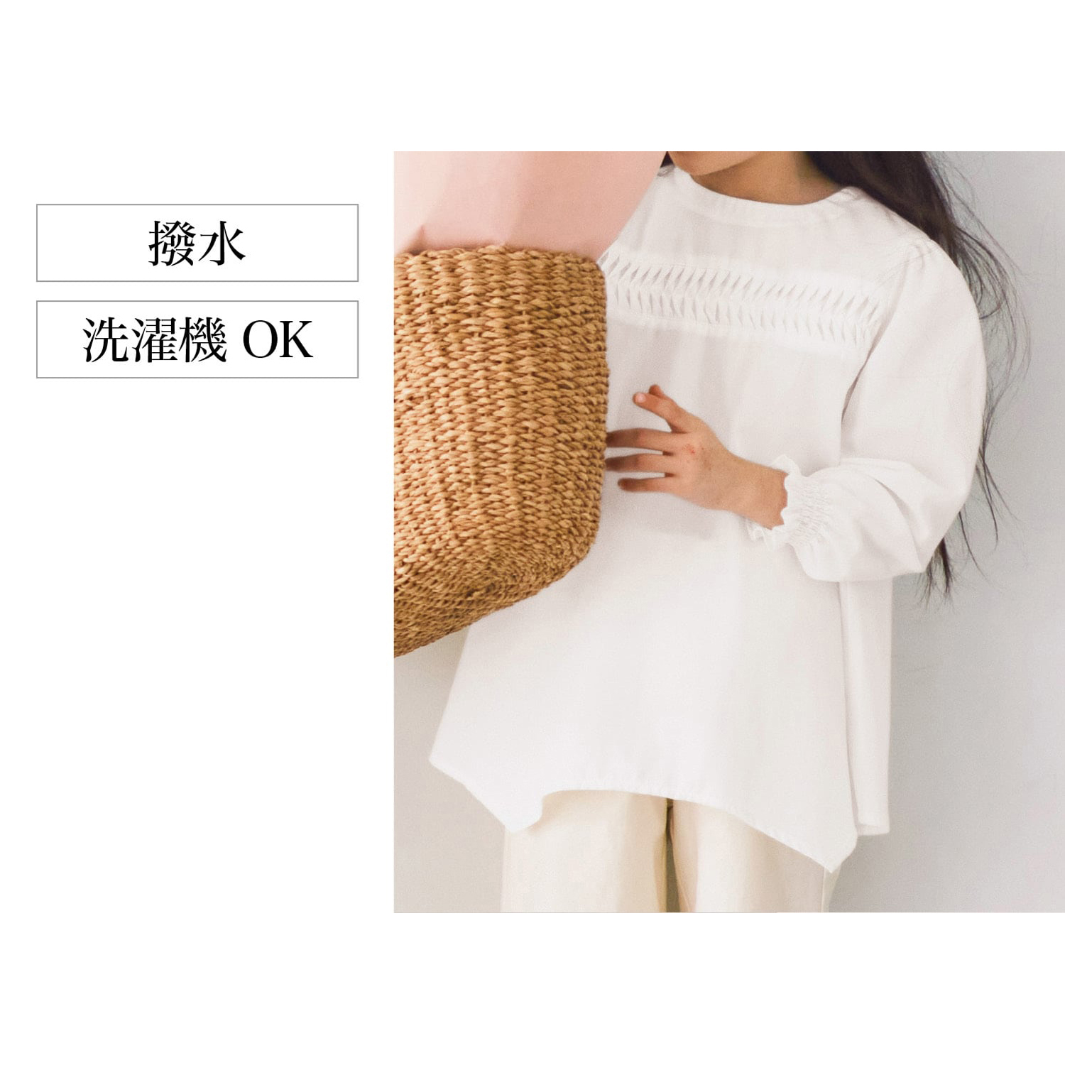 ―デザイン・スタイリング―・動くたびにふわりと揺れるヘムラインが印象的なブラウス・胸元のデザインタックが品の良いアクセントに・袖口はゴム入りで腕まくりもラクラク・脱ぎ着しやすい後ろ襟ぐりゴム仕様もうれしいポイント・リンクコーデが楽しめるレディースサイズもご用意―素材―・軽い着心地がうれしい綿タッチのポリエステル100%・シワになりにくくお手入れも簡単―機能―・撥水加工「パワプロダクツ(R)」を施しています※水をはじいて親水性の汚れを落ちやすくし、食べこぼしなどによってついてしまった「ケチャップ・ソース・醤油」汚れも24時間以内であればご家庭のお洗濯でキレイに落とすことができることを、公的機関により実証済みです。きれいな「白」が続くのが気持ちいい!但し、全ての汚れに対応する物ではありません。また、より効果を発揮するために、付着後1時間以内に洗うことをおすすめします。FAIRE UN CALIN(フェールアンカラン)-抱きしめる-ママの声から生まれた!ママと子どものための『白い服』なにかと制約の多い子育て中のママは「着たい服」より「着られる服」を選びがち。着るだけで気分があがる「白」を身にまとい、思いっきり子どもを抱きしめる!そんなママの幸せを願ってうまれた『汚れにくい白』のブランドです。