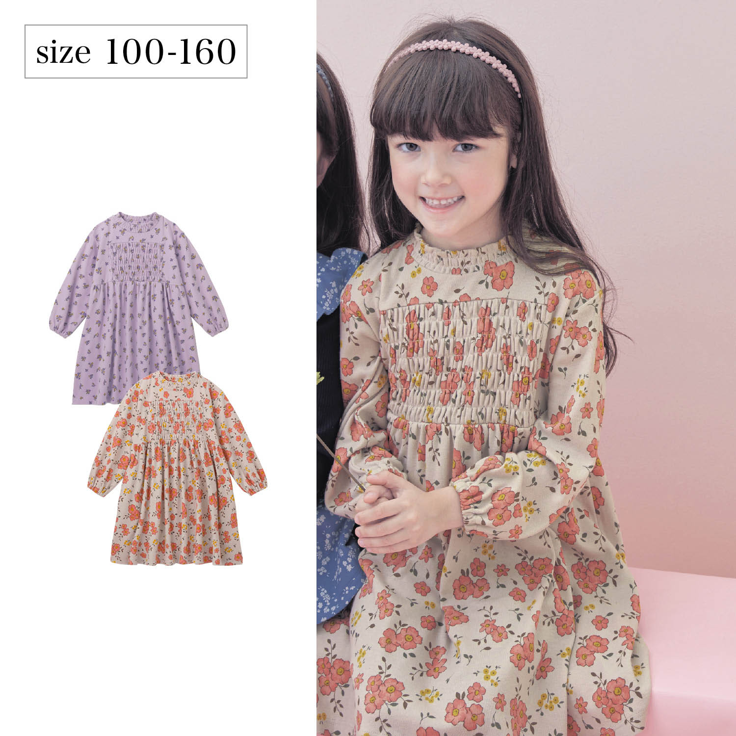 【ベルメゾン】胸元シャーリングハイネック花柄長袖ワンピース 【子供服】
