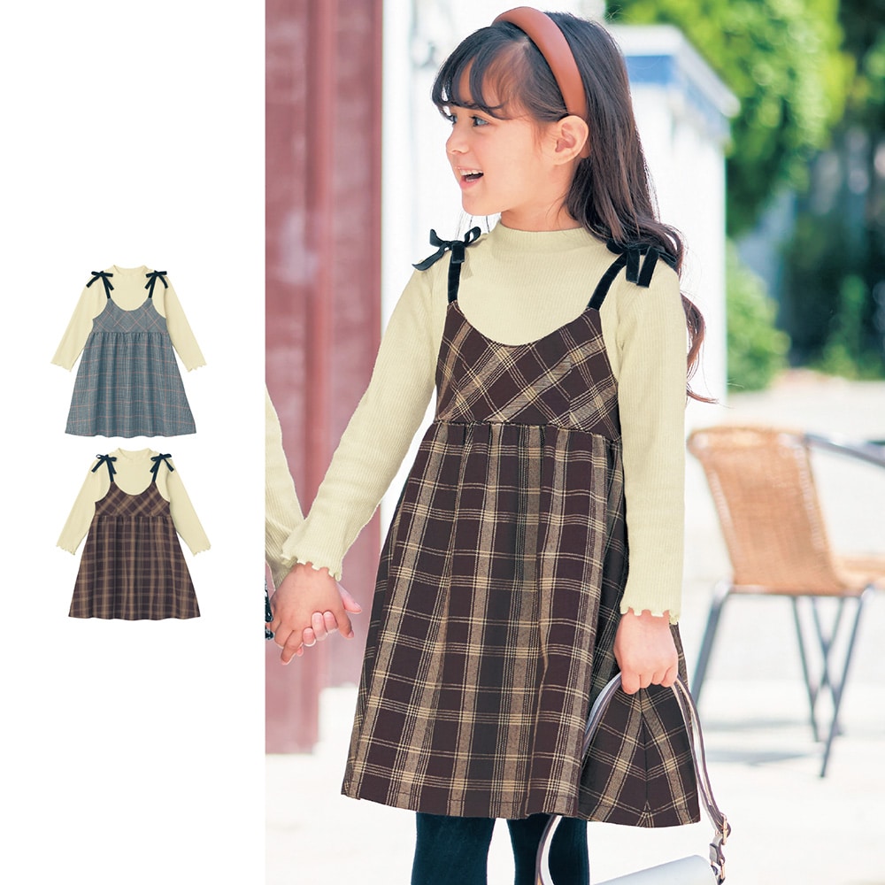 【ベルメゾン】ベロアリボンチェックドッキング長袖ワンピース 【子供服】