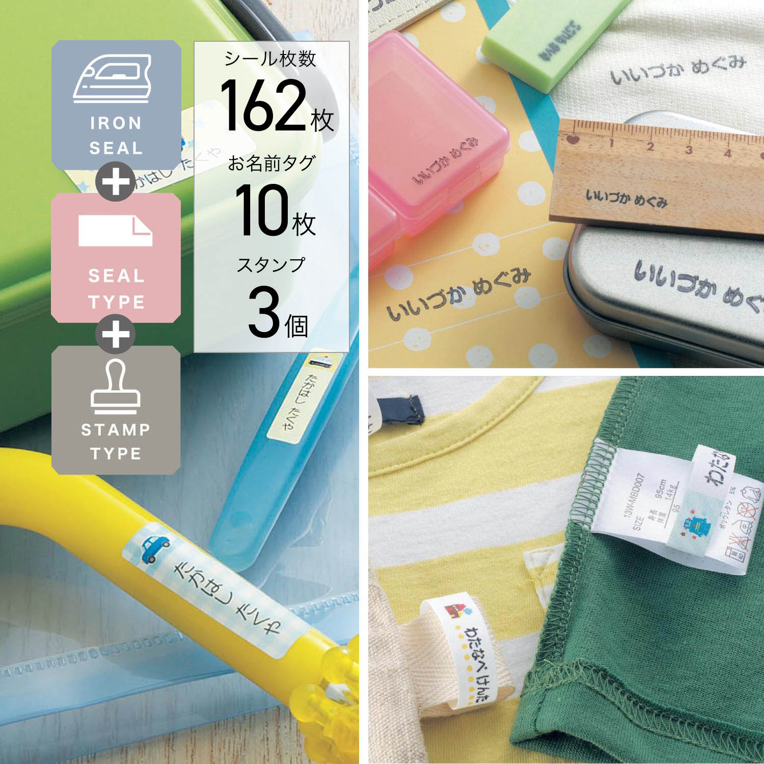 忙しくて時間のない方も、字に自信がない方も不器用な方も。細かいものにまで名入れする大変さもこのセットがあれば解消!水に強い撥水シール、アイロンで布ものに付けられるアイロンシール、くるっと輪っかになって付けられるお名前タグ、紙や布だけでなく金属やプラスチックにも使えるスタンプで、一気に名入れができます。入園・入学準備はこれで安心。