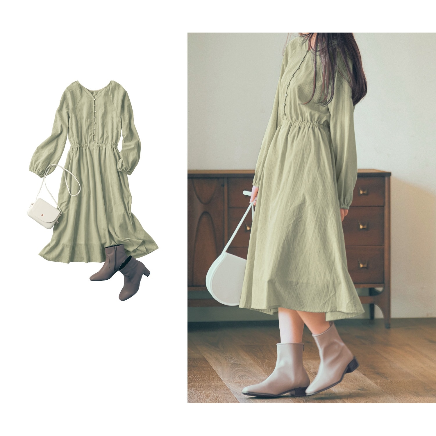 ―デザイン・スタイリング―・華やかなミモザ柄が春にぴったりのワンピース・1枚で主役になれる上品な可愛さ・フルオープン仕様なので羽織にも・袖口はゴムシャーリングでふんわり愛らしいシルエットに―素材―・表地はサラリとした軽い着心地の平織り素材