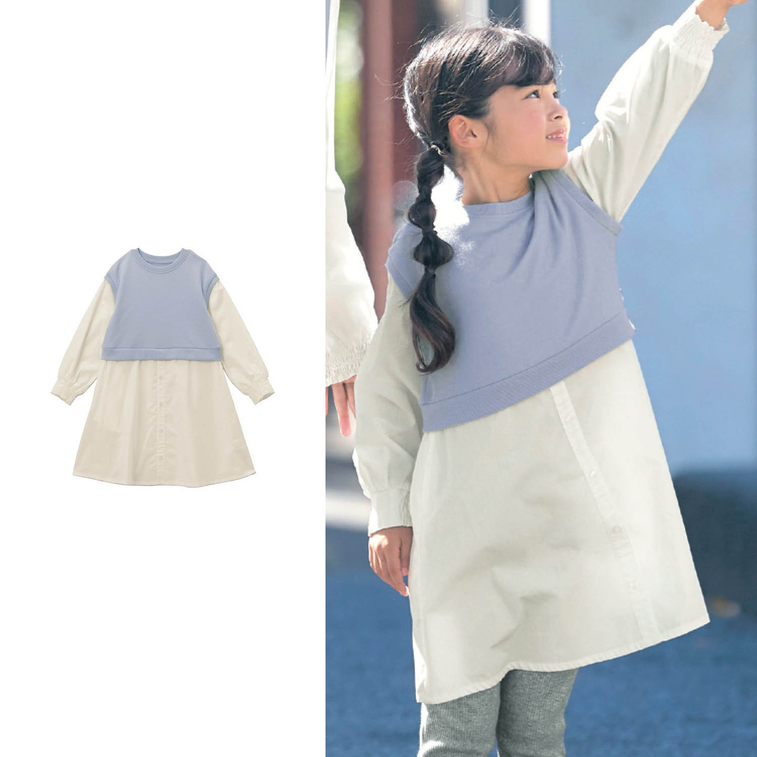 ―デザイン・スタイリング―・技ありレイヤードコーデが一枚で完成するらくちんワンピ・トレンドのふんわりスリーブが愛らしい・袖口はシャーリングゴム入りで腕まくりもOK・親子リンクが楽しめるレディースサイズもご用意・キッズ用は軽快に動きやすいひざ下丈―素材―・袖とスカート部分は上品な質感の綿100%ブロード・オフホワイトはやや透け感のある素材