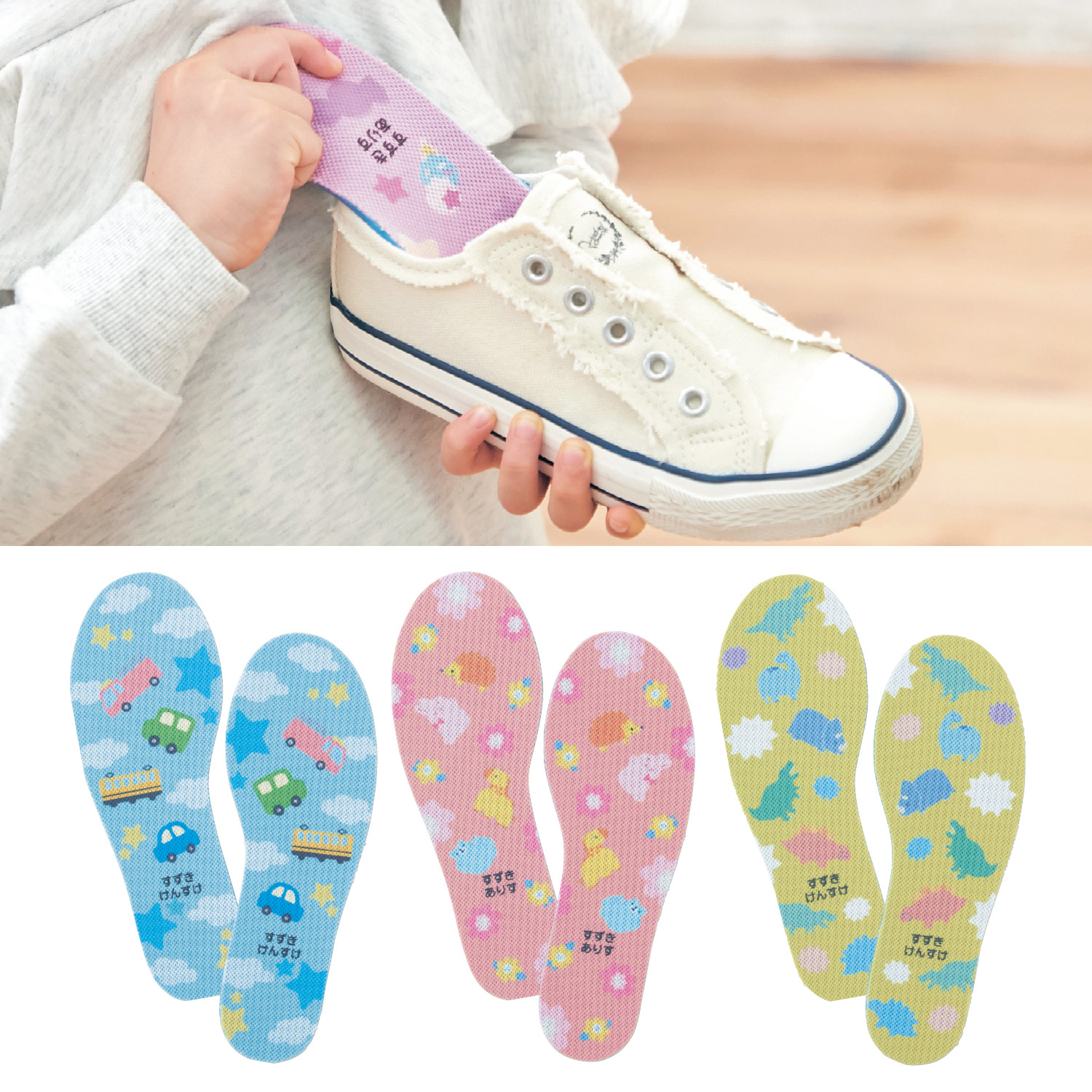 似たような靴もひと目で見分けがつくインソール。高反発クッションで元気に走り回る子にも◎。抗菌防臭、吸水速乾機能で汗をかいてもベタつかず、ムレにくいのもうれしい。