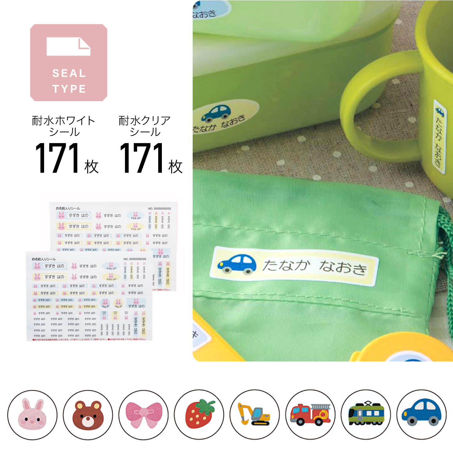 水や油、汚れにも強いから、お弁当やコップ、文房具などにピタッと貼れます貼る物の色が濃くても、お名前がはっきり目立つ白ベースと、貼られる物の色をじゃましない透明ベースの2タイプのシールをセットにしました8柄から選べます