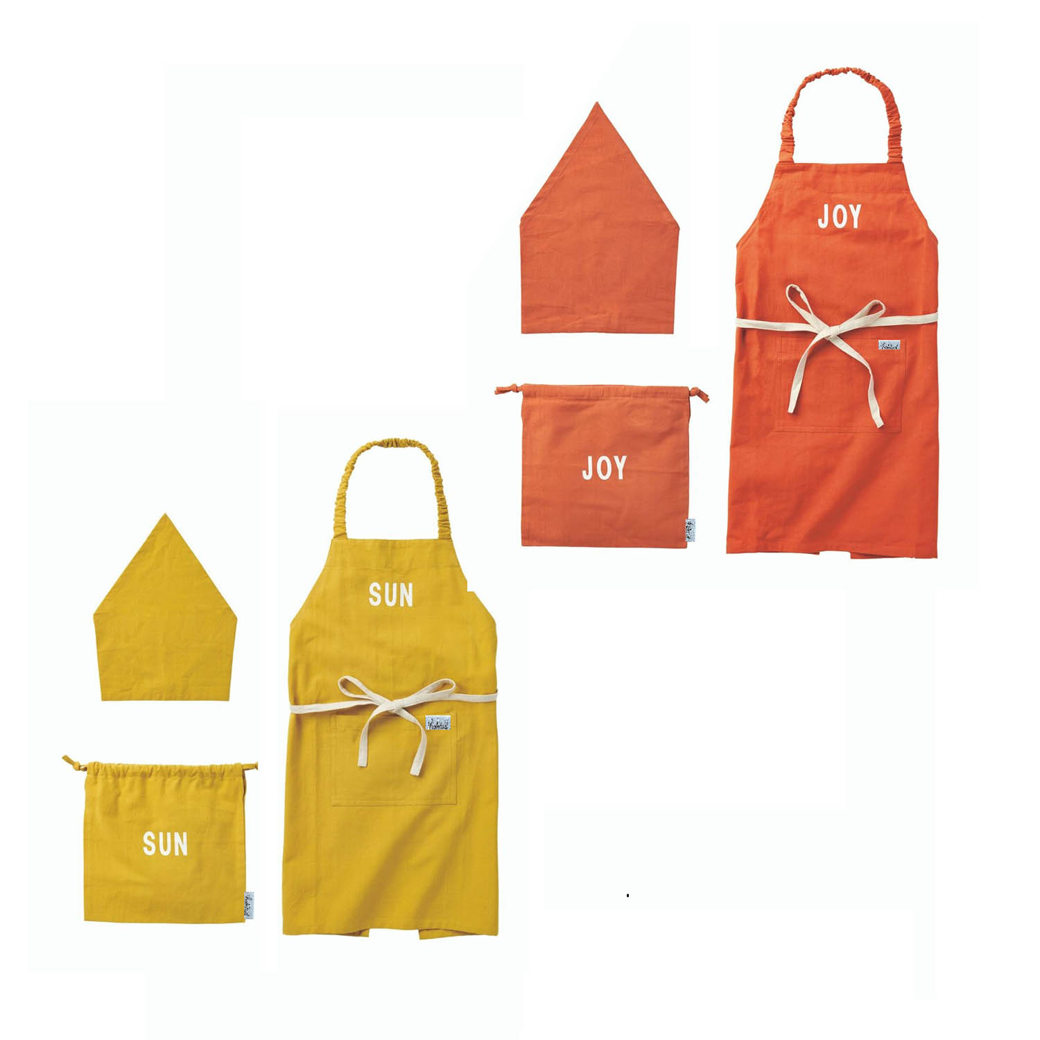 ビビッドなオレンジ、イエローに白のロゴプリントが大人っぽく、かわいいエプロン。同色の三角巾・巾着がセットです。少し大人っぽいテイストが、おしゃれで気分が上がりそう。夏休みなどおうちにいることが増える時期にも、自分のエプロンがあればお料理のお手伝いや、ママと一緒にお菓子作りなど、やる気が起きそうですね。巾着がついているので、持ち運びや保管も便利!