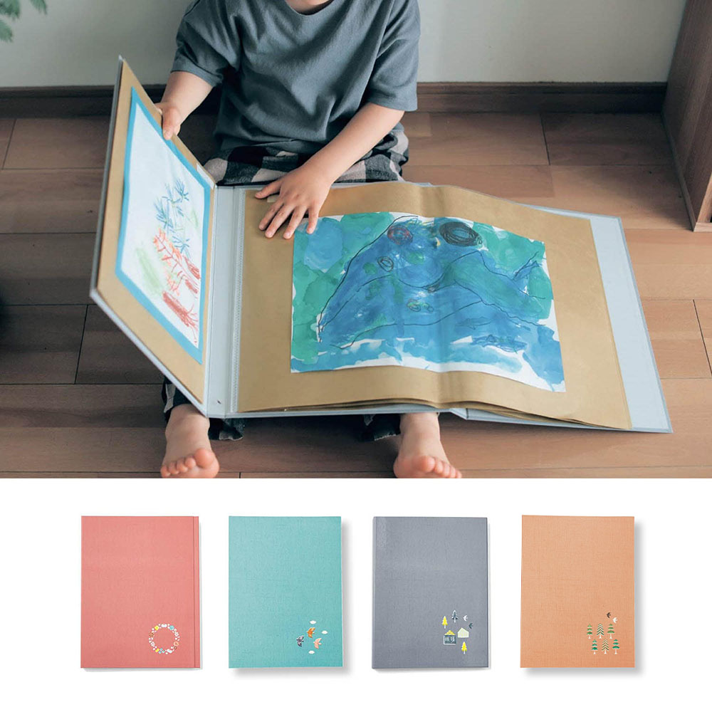 ―機能―・どんどん増えていく子どものお絵かき作品を大切に保管・成長の証として残せる作品ファイル・八つ切り16枚、四つ切り16枚の計32枚の画用紙を収納可能・リフィルにはクラフト紙が入っており、おりがみなど小さな作品を貼って、保管することも―デザイン―・三つ折りなので大きな作品も傷つけることなくコンパクトに・おしゃれな生地貼り風表紙デザイン、ワンポイントモチーフも魅力