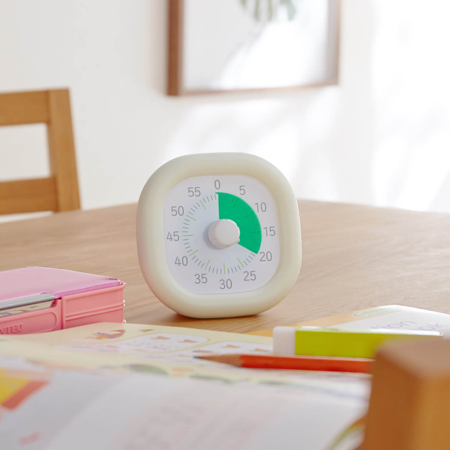 時間の経過とともにフィルムが回転、色面が減っていくので、時間の経過を視覚的に実感できます。時計が読めない、時間感覚がまだ身についていないこどもにもおすすめ。カウントダウン終了を「ピピピッ」の電子音でお知らせします。カウントダウン中はカチカチ音が気にならない静音作動設計。ダイヤルを回してセットするだけ!こどもでもカンタン操作持ち運び、収納しやすいサイズのコンパクトタイプ。見やすい角度で自立します。