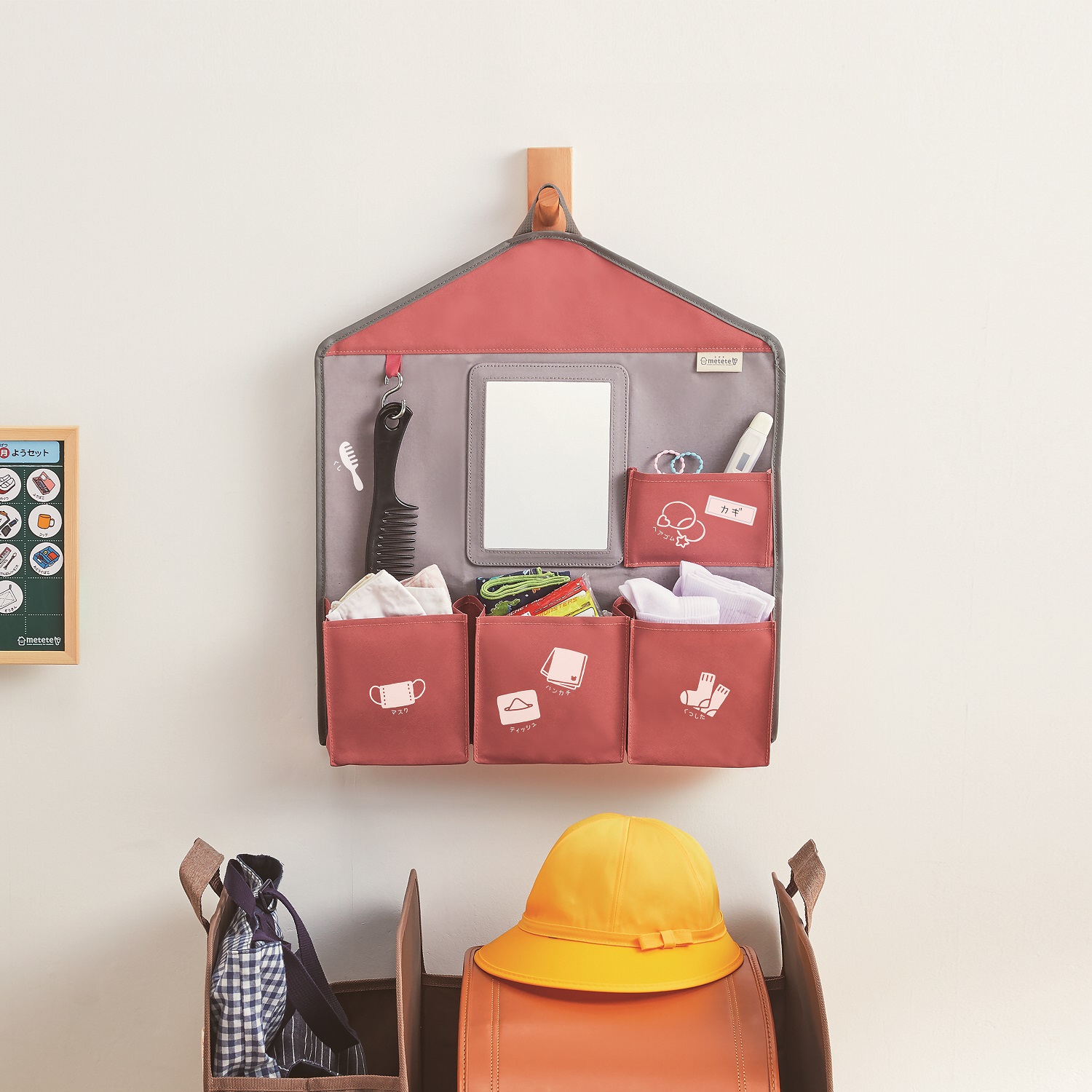 子どもは身じたく・身だしなみなどの朝の準備に時間がかかる。お母さんがチェックするのは大変!そんな悩みを解決します。定位置が一か所に決まると、効率がアップし、毎朝の身じたく・身だしなみチェックが習慣化し、自分でできるようになります。朝の準備グッズが一か所に揃っていると、忘れない!バタバタしない!準備がスム-ズに完了!マスク・ハンカチ・ティッシュ・くつ下・ヘアゴムなどが一式収納できる「4つのポケット」付寝ぐせ・口周りの汚れ・鼻水などの身だしなみをチェックできる「ミラー」付くし、鍵などをS字フックでかける「ループ」付収納するポケットを決めて、その中身をイラストで分かりやすく表示できるアイロン不要の「布用シール」付