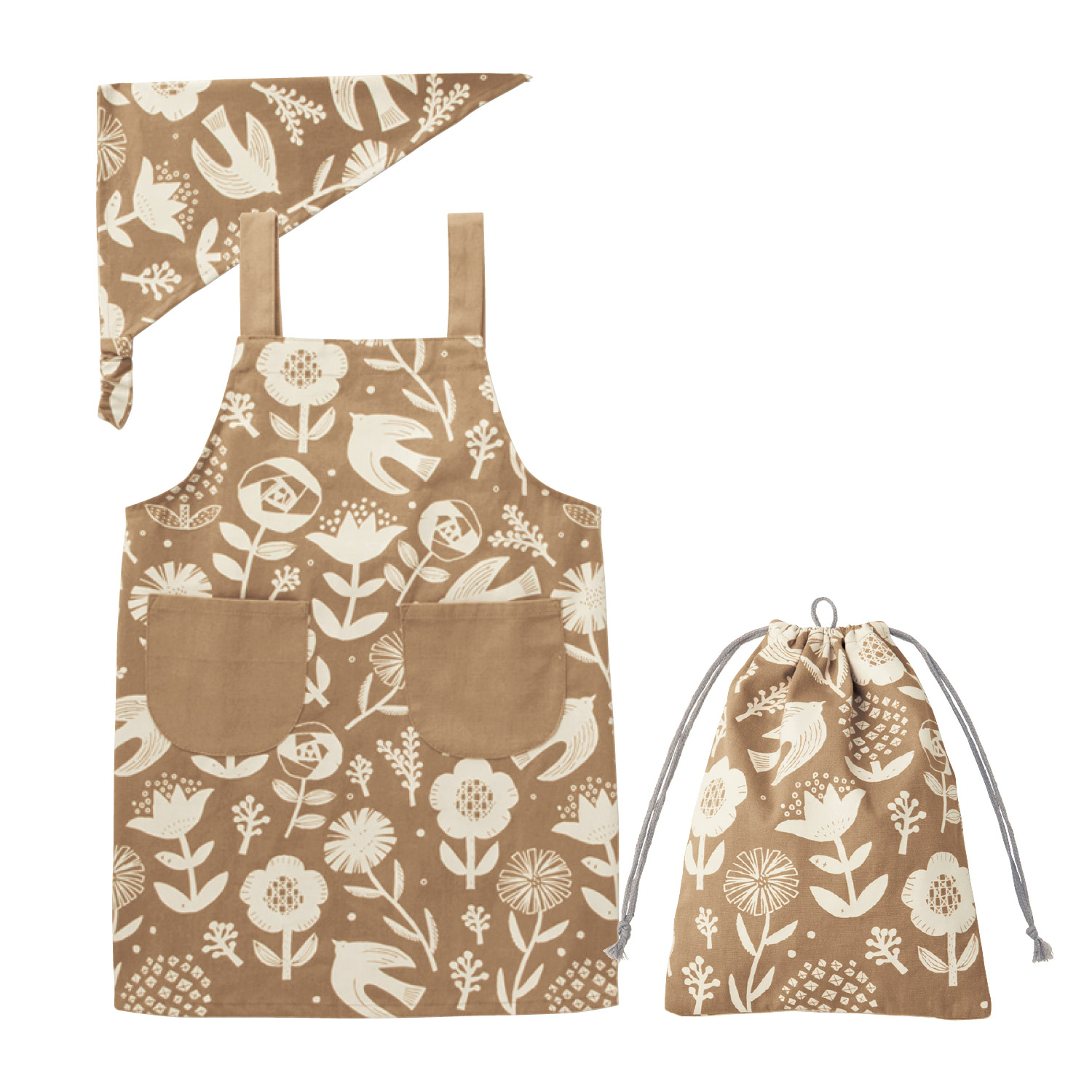 ―デザイン・スタイリング―・お子様でも自分で簡単に着脱できるゴムタイプのエプロン & 三角巾・落ち着いたカラーがおしゃれな印象で、大きくなっても使いやすい・お気に入りが選べる豊富な柄展開も魅力―機能―・エプロンも三角巾も後ろがゴム仕様なので、かぶるだけでOK・お揃いの巾着袋に収納できるから、持ち運びにも便利・エプロンの肩ひもはボタンで長さ調節可能・巾着は机に引っ掛けられるループ付き・裏面にお名前スペース付き
