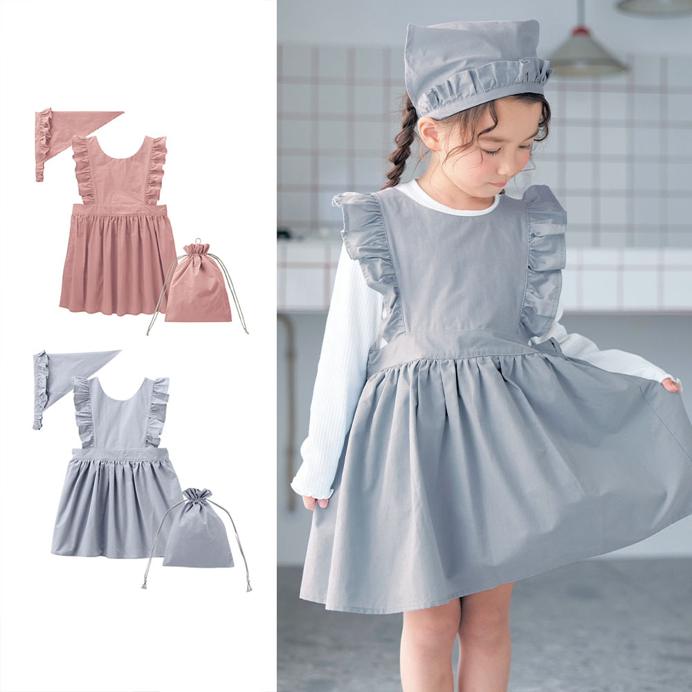 ―デザイン・仕様 ―・大人っぽい上品なピンクにフリルが愛らしさいっぱい・後ろにもリボンをあしらい、とびきり可愛く仕上げています・エプロンも三角巾も後ろがゴム仕様なので、かぶるだけでOK・小さなお子様でも自分で簡単に着脱できます・お揃いの巾着に収納できて持ち運びにも便利・後ろゴム仕様で着脱しやすく、着け心地もラクー機能ー・巾着は机に引っ掛けられるループ付き・裏面に油性ペンで直接書けてにじみにくいお名前スペース付き