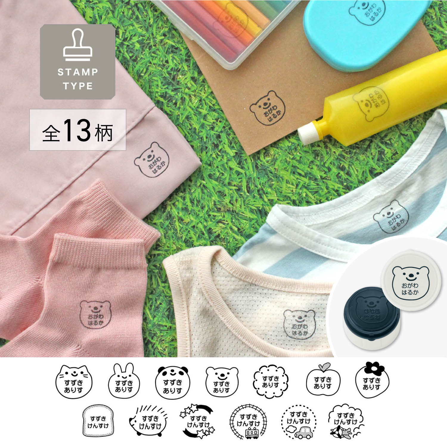 ーデザイン・スタイリングー・可愛いモチーフがダイカットになった名前スタンプ・まだ字が読めない子どもも自分の!と認識しやすい・動物や乗り物など、遊び心あふれる豊富なデザインー素材ー・スタンプ本体はABS樹脂・インクの色はブラックー機能ー・ポンポン押せるインク充填式・ひらがな、カタカナ、アルファベット(大文字)対応・お名前は8文字までOK・プラスチック、金属、布、木、紙、ゴム、皮革などのいろいろな素材に使えます