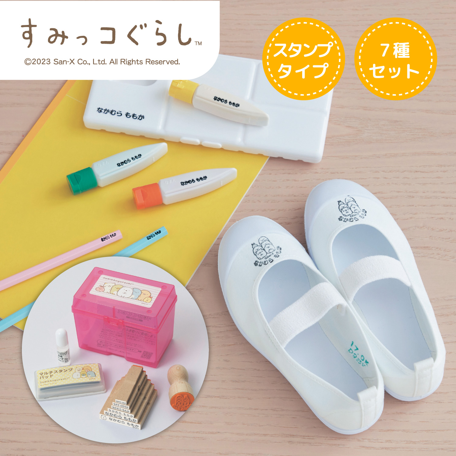 ー機能ー・プラスチックや金属にも押すだけでOK・お名前を付けなければいけない様々な素材に対応・持ち物一つひとつにお名前付けする手間を軽減・7種セットなので使い分けできて便利・にじみにくい特殊インクのスタンプ台とケース付き・インクは速乾性だから扱いやすいーデザイン・スタイリングー・すみっコぐらしのキャラクター達が「自分のしるし」に・かわいさに心はずんで新生活がより楽しくなりそう