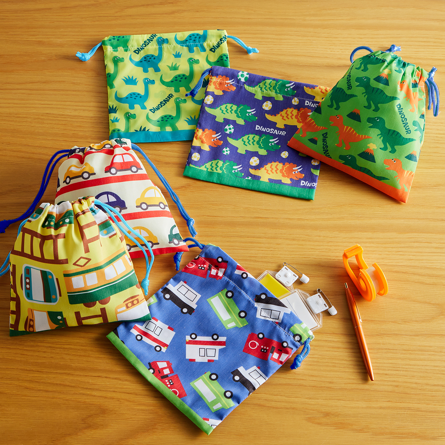 お得な3柄セット保育園や幼稚園で大活躍カラフルな車や恐竜柄をプリントサラリとして洗っても乾きやすいポリエステル素材小物など種類問わず収納OK