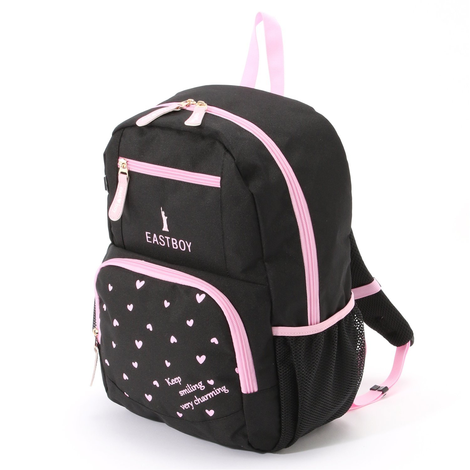 【おしゃれなこだわりのデザイン】・女の子らしいキュートなハート柄・引き手にもロゴを施しアクセントに・選べるうれしい4色展開【使い勝手の良いポイント】・開け閉めしやすいダブルファスナーのメイン室・小物の整理整頓に便利なポケットを配置・内側にお名前が記入できるネームタグ付き遠足や旅行などで活躍する15Lのリュック。ポケットが豊富で、細々としたものをすっきり整理ができます。ブラックとパステルカラーの選べる4色展開です。