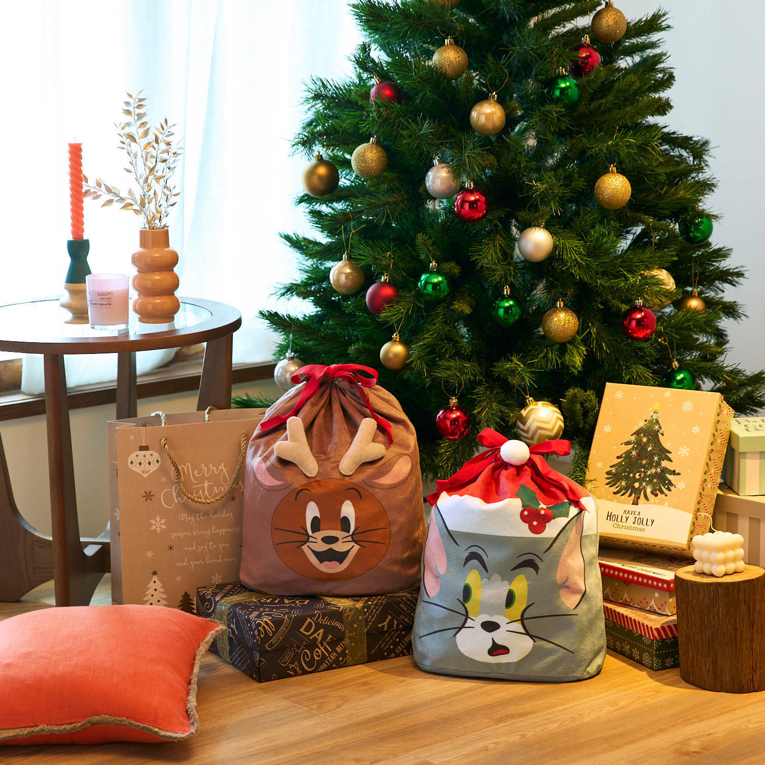 ・トムとジェリーがクリスマス仕様になった巾着袋・トムの帽子の白いボンボン、ジェリーのトナカイのツノが立体的な造り・表地は手触りが滑らかなマイクロファイバー素材・裏地は物の出し入れがしやすい滑りの良いサテン素材・飾って眺められる収納袋・旅行のパッキングにも使える・巾着部分の赤いリボンがプレゼントのようで可愛い!