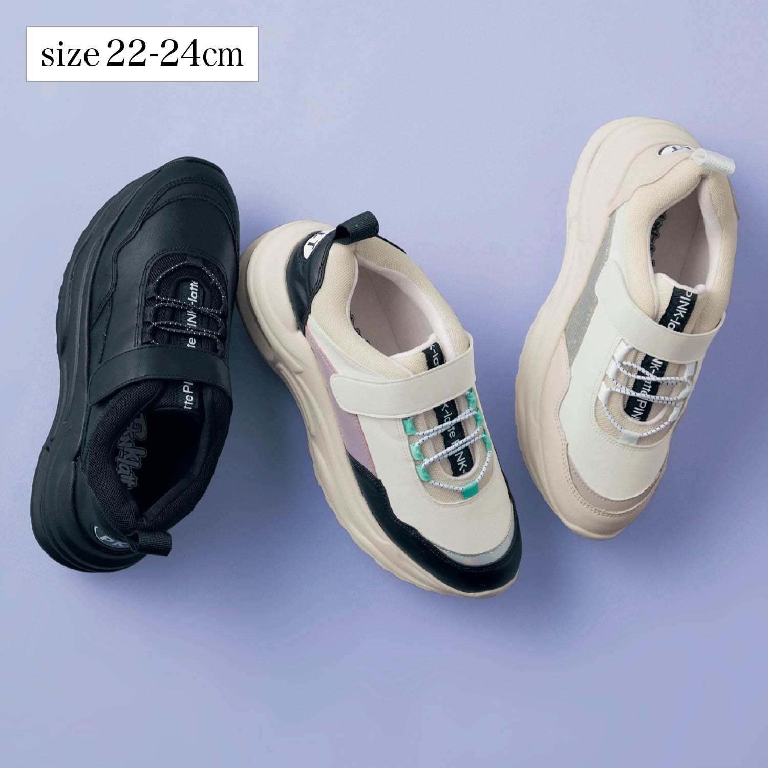 ―デザイン・スタイリング―・トレンド感のあるゴツめデザイン・盛れる厚底ソールが今っぽさ満点・エアー入りソールで歩きやすさ抜群・後ろ、中敷き、フロントにロゴ入り・靴下を合わせても可愛い―機能―・マジックテープ×ゴムひもで脱ぎはき楽ちん
