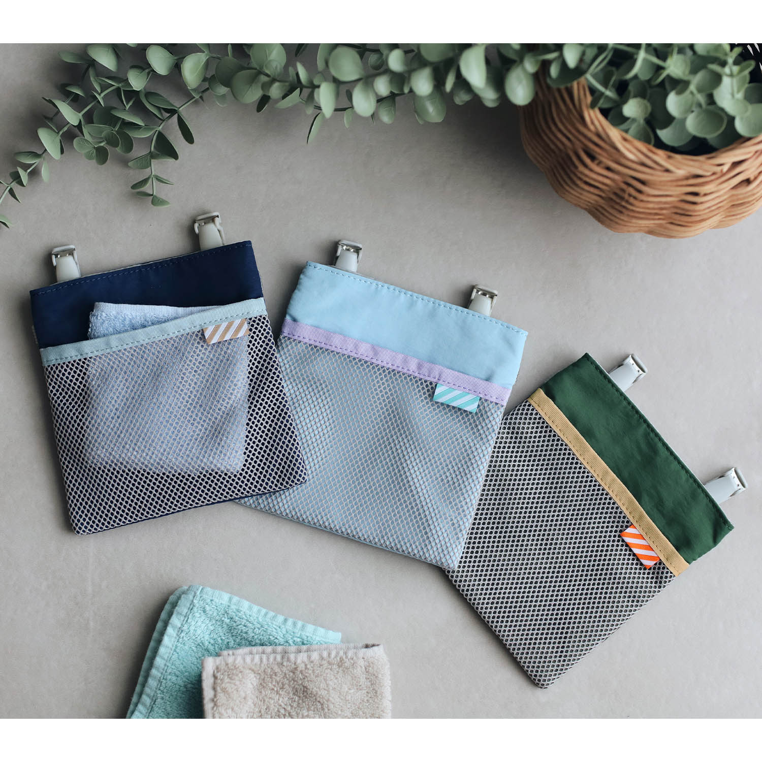 ―デザイン・スタイリング―・人気インスタグラマー & ブロガーのきなこさんとコラボ・ボトムにクリップで後付けできるポケット・装いに合わせやすい無地のシンプルなデザイン・ストライプ柄のタブがさり気ないアクセント―機能―・表面のメッシュポケットが濡れたままのハンカチを入れるのに便利・側生地は水滴をはじく撥水加工済み・背面にはティッシュポケットもプラス・中央にマスクなどが入るオープンポケット付き
