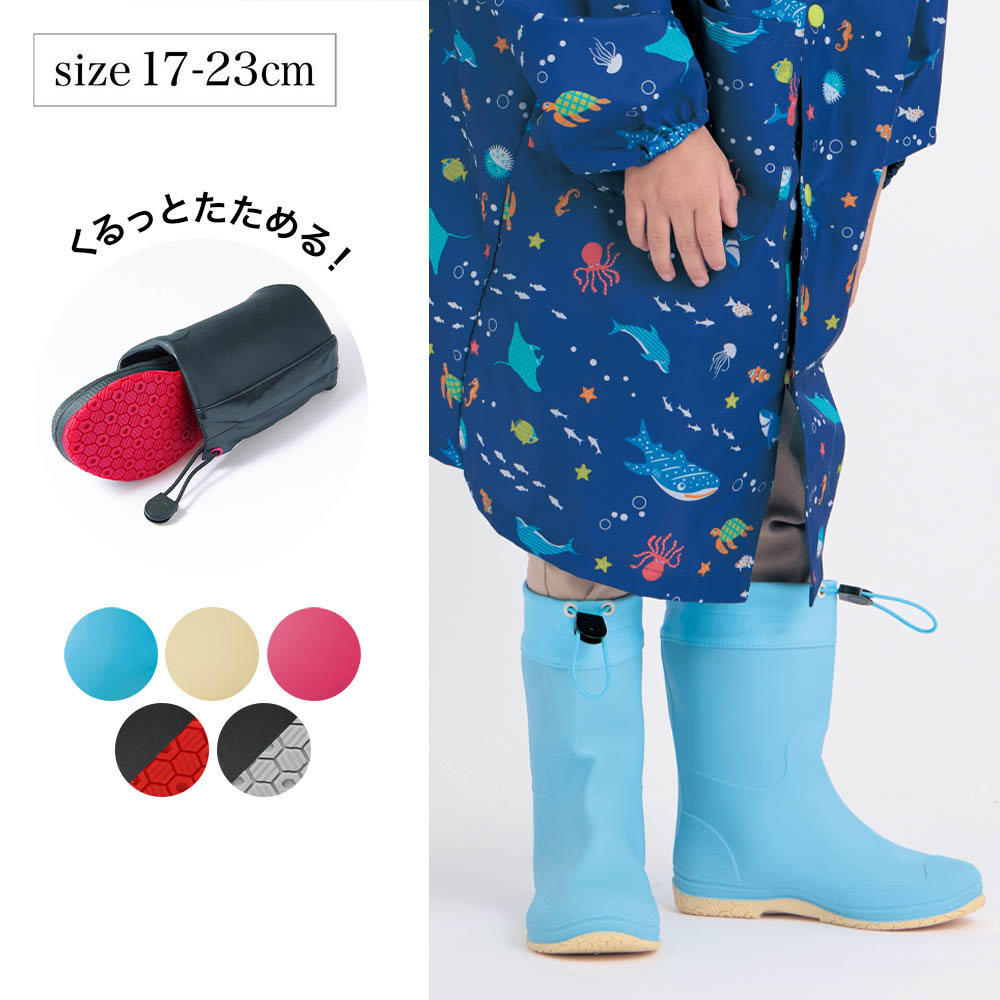 ―デザイン・スタイリング―・ソールの配色がアクセントになったレインブーツ・クルクル畳み収納袋に入れ、持ち運ぶことができます・いざという時にあると便利なアイテムー機能ー・履き口には雨などの侵入を防ぐドローコード付き・取り外して洗えるインソール付きで清潔感をキープ・ブーツを収納できるおしゃれなクリアバッグが付属・内側に油性ペンで直接書けてにじみにくいお名前スペース付き