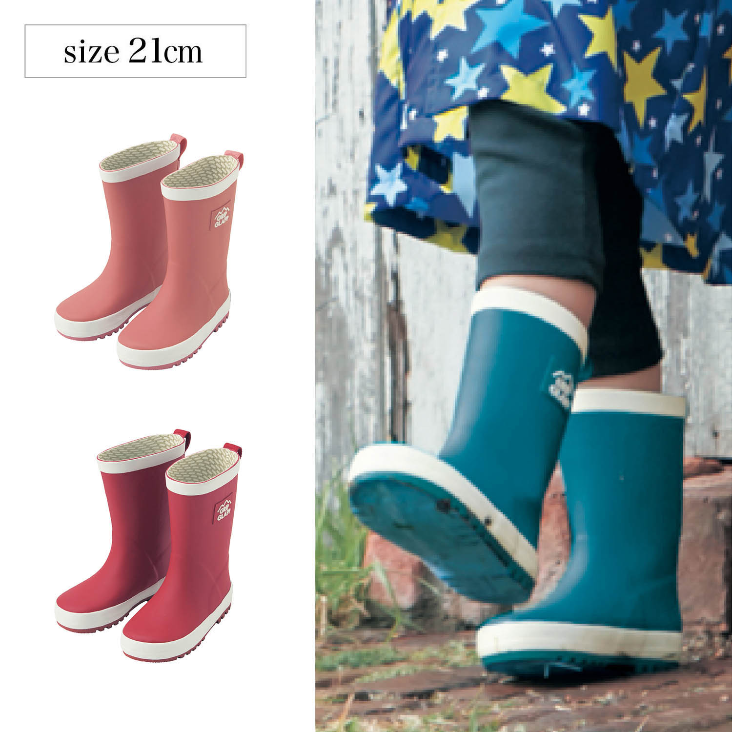 ―デザイン・スタイリング―・ブランドマークと配色でアクセントを効かせた、シンプルなデザインのレインブーツ・ゴム製で柔らかく動きやすいので、雨の日も元気に歩けます・泥や雪にもしっかり対応し、一年を通して活躍ー機能ー・かかとに反射材を使用し、夜間の車などからの視認性を高めます